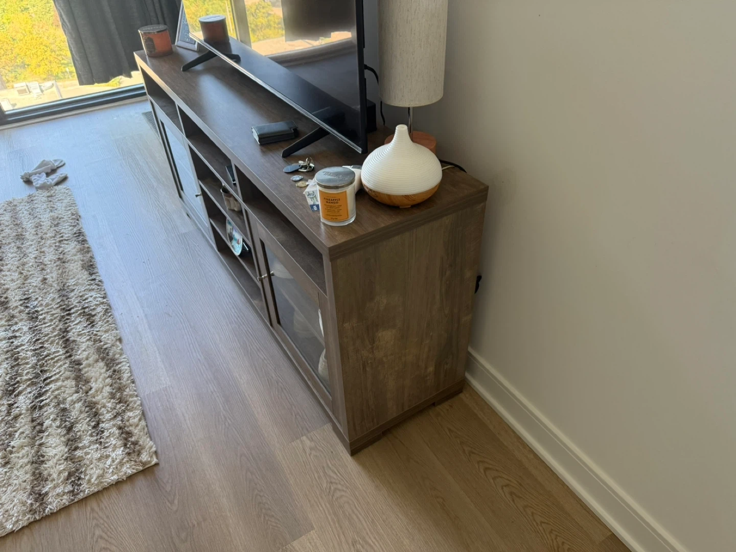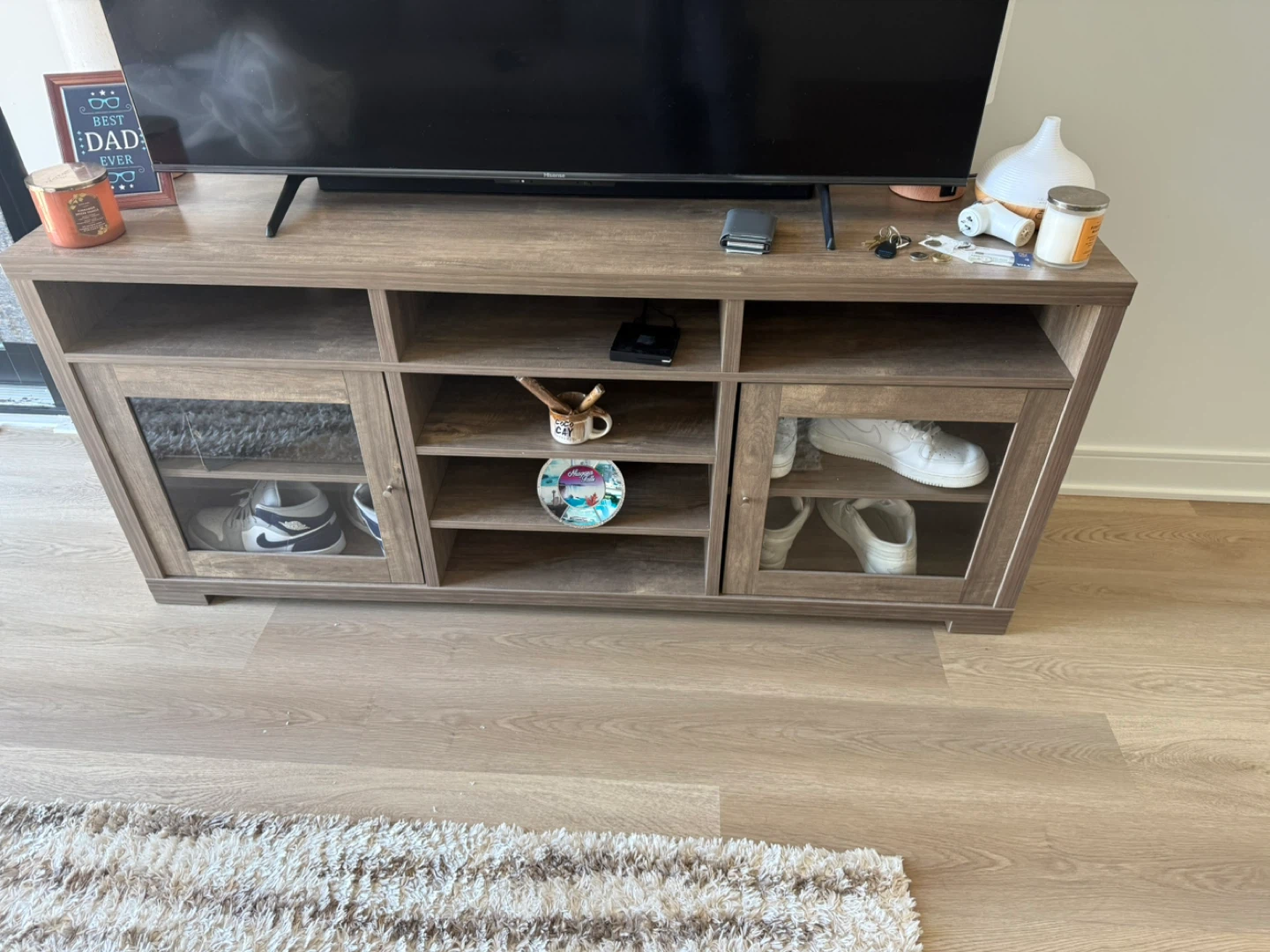 Selling a sturdy brown wood TV stand. It features glass doors and open shelving, perfect for storing media devices and displaying decor. Great condition and ready for a new home!