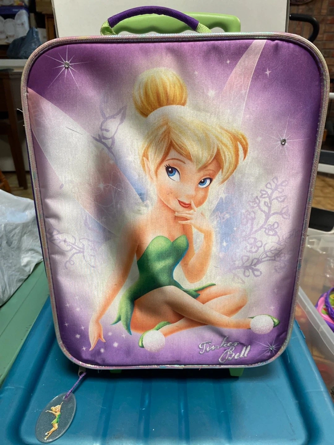 This is a Tinker Bell carry-on school bag backpack. With pull up handle and Zip around plus wheels. Gently used condition.