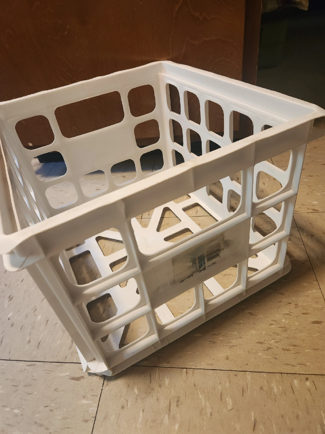 Giving away a white plastic milk crate, perfect for storage or organization! some edges chipped away but it can still hold your vinyl records, odd shaped objects, and whatnots.
