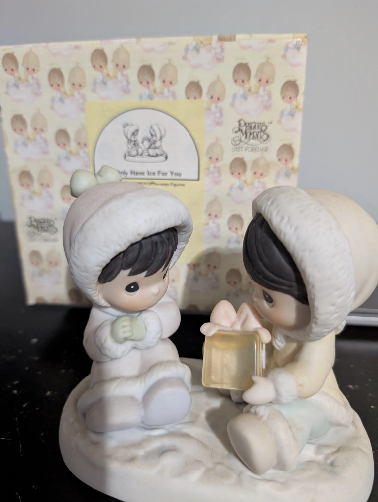 This is a Precious Moments figurine titled "I Only Have Ice For You". It features two children dressed in winter clothing, with one offering a gift to the other. The figurine comes with its original box, making it a great addition to any collection!