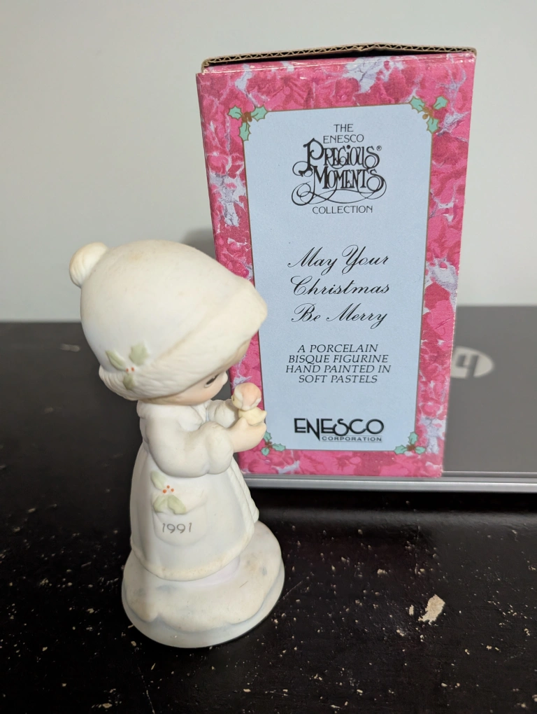 Selling a Precious Moments figurine from Enesco, titled "May Your Christmas Be Merry"! This porcelain bisque figurine is hand-painted in soft pastels. It appears to be from 1991 and comes with the original box. A sweet addition to your holiday decor!