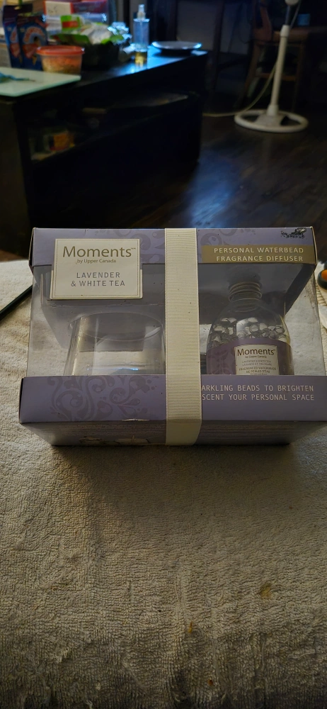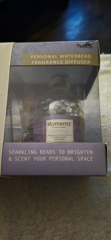 Selling a Moments by Upper Canada Personal Waterbead Fragrance Diffuser in Lavender & White Tea scent. It includes sparkling beads to brighten and scent your personal space. It is still in the original box!