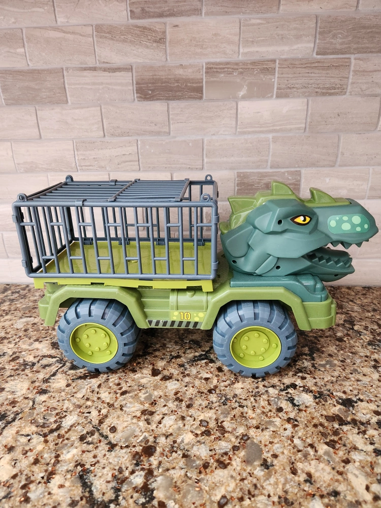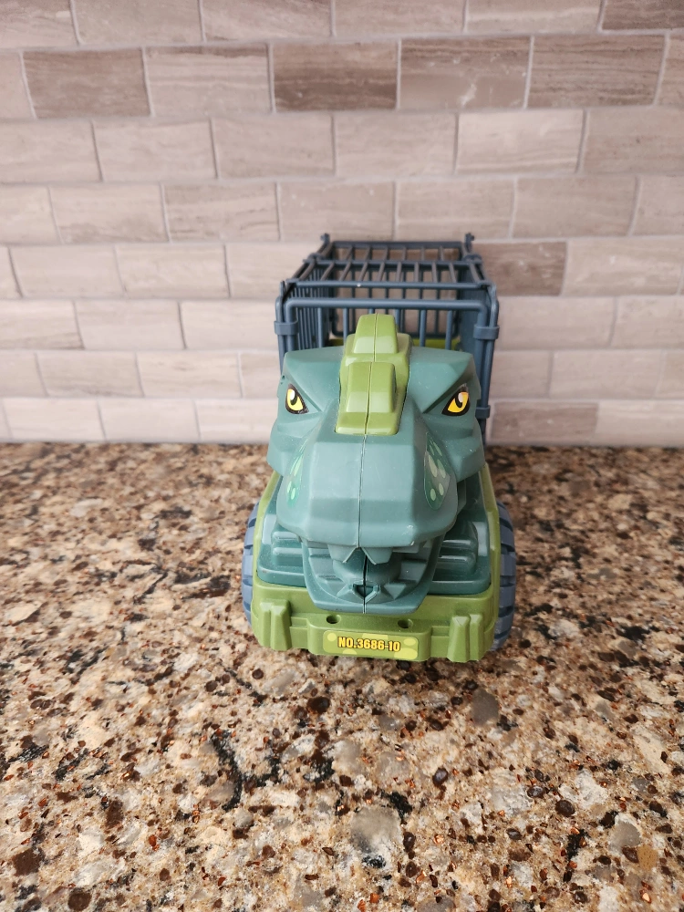 A dinosaur truck toy! It's plastic and ready for a new home. The truck features a dinosaur head and a cage on the back, perfect for imaginative play