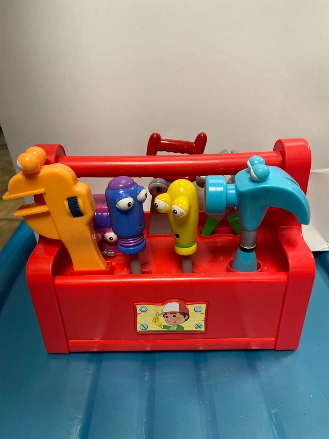 Selling a Disney Handy Manny Interactive Tool Set Toy. Comes with tool box and 7 Tools. All tools are removable. Great used condition!! Sold as is. Tested and works great. Plays a song and says a few different phrases each time you press the button on the front of the tool box. When the song plays some of the tools bob up and down! *Batteries not included. Needs new batteries: AA x3.