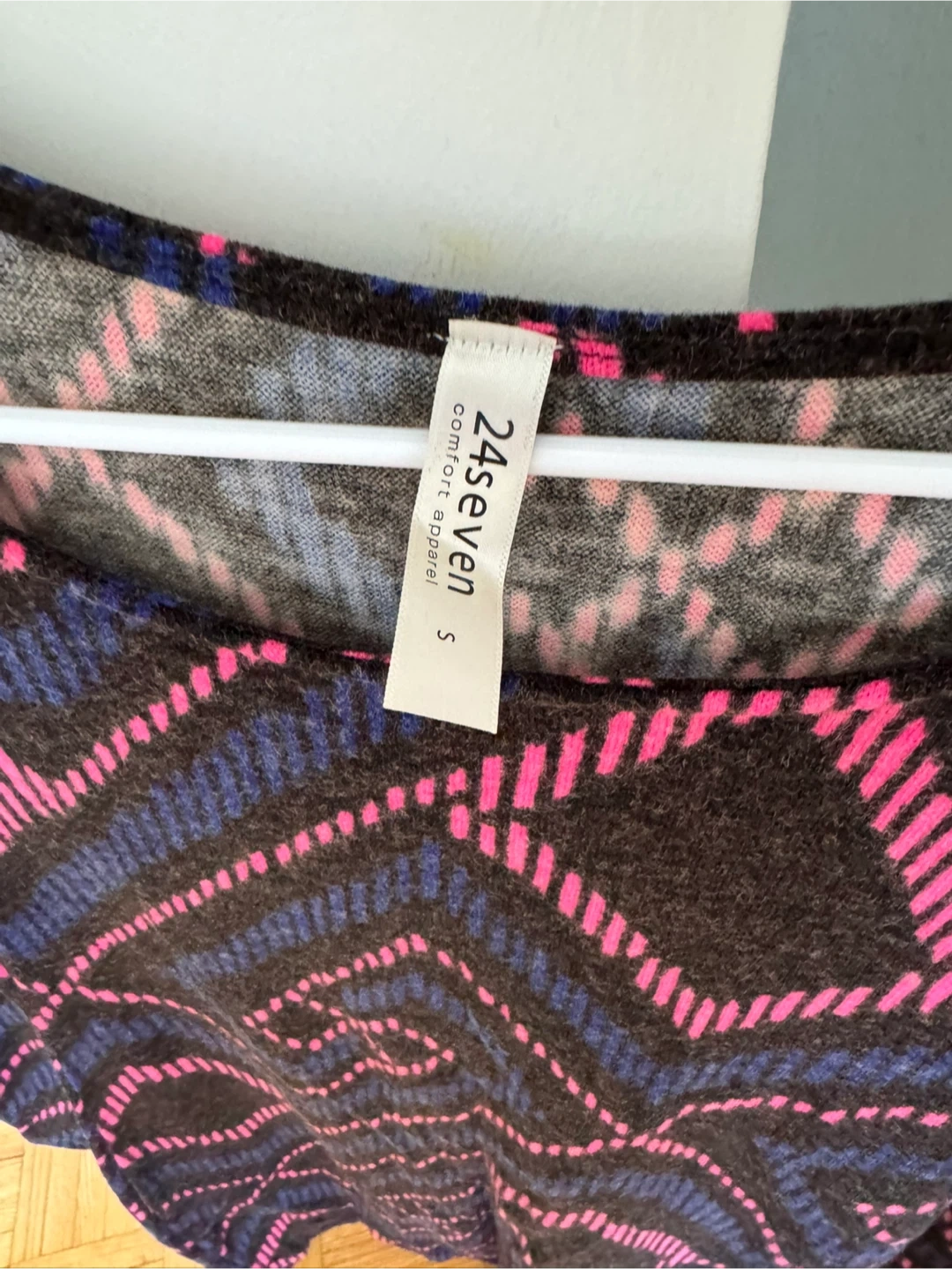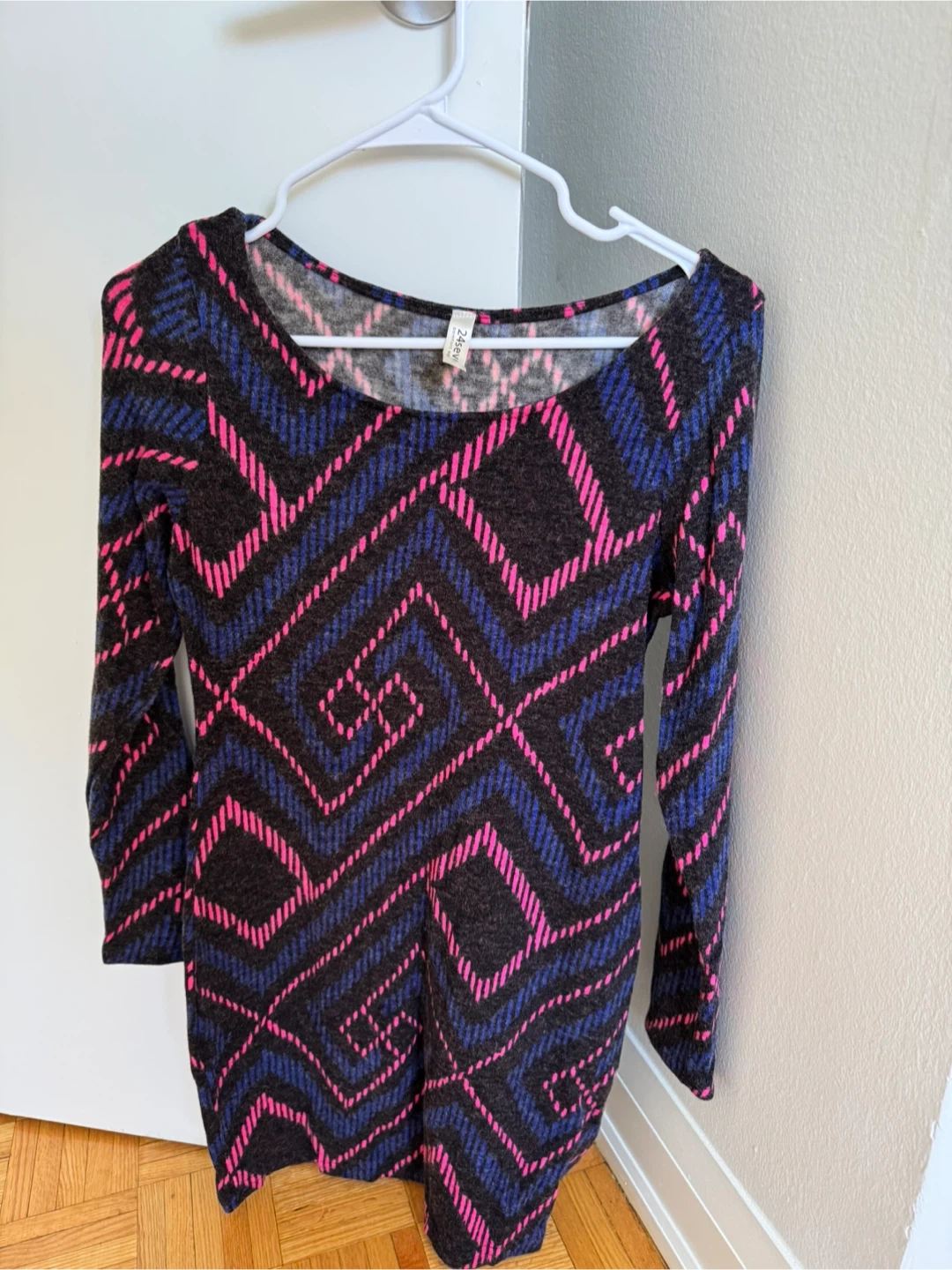 The dress features a unique pattern with pink and blue accents on a dark background. The dress is a size small.