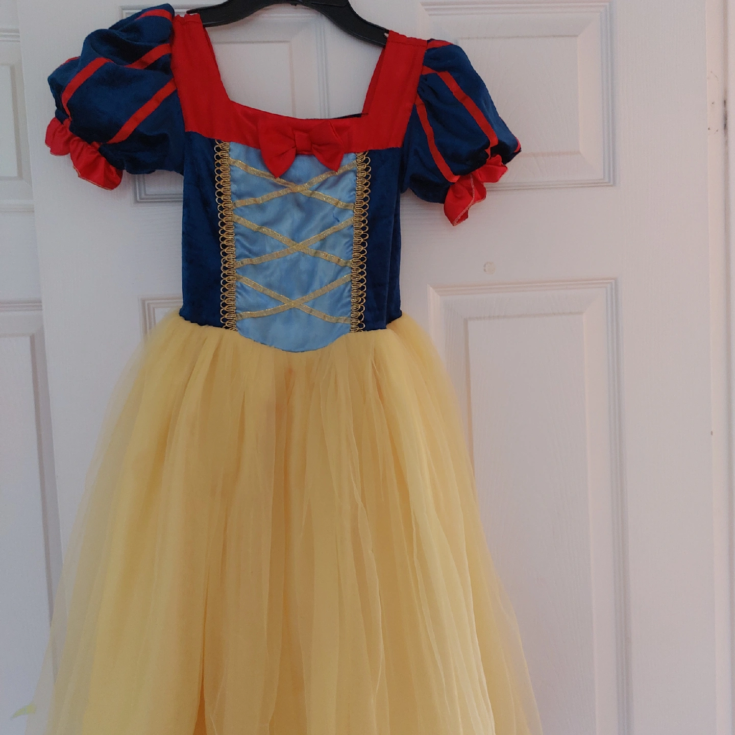 15Selling a Snow White costume dress. It features a blue velvet-like bodice with gold detailing, red accents on the sleeves and collar, and a flowing yellow tulle skirt. Perfect for dress-up or Halloween!