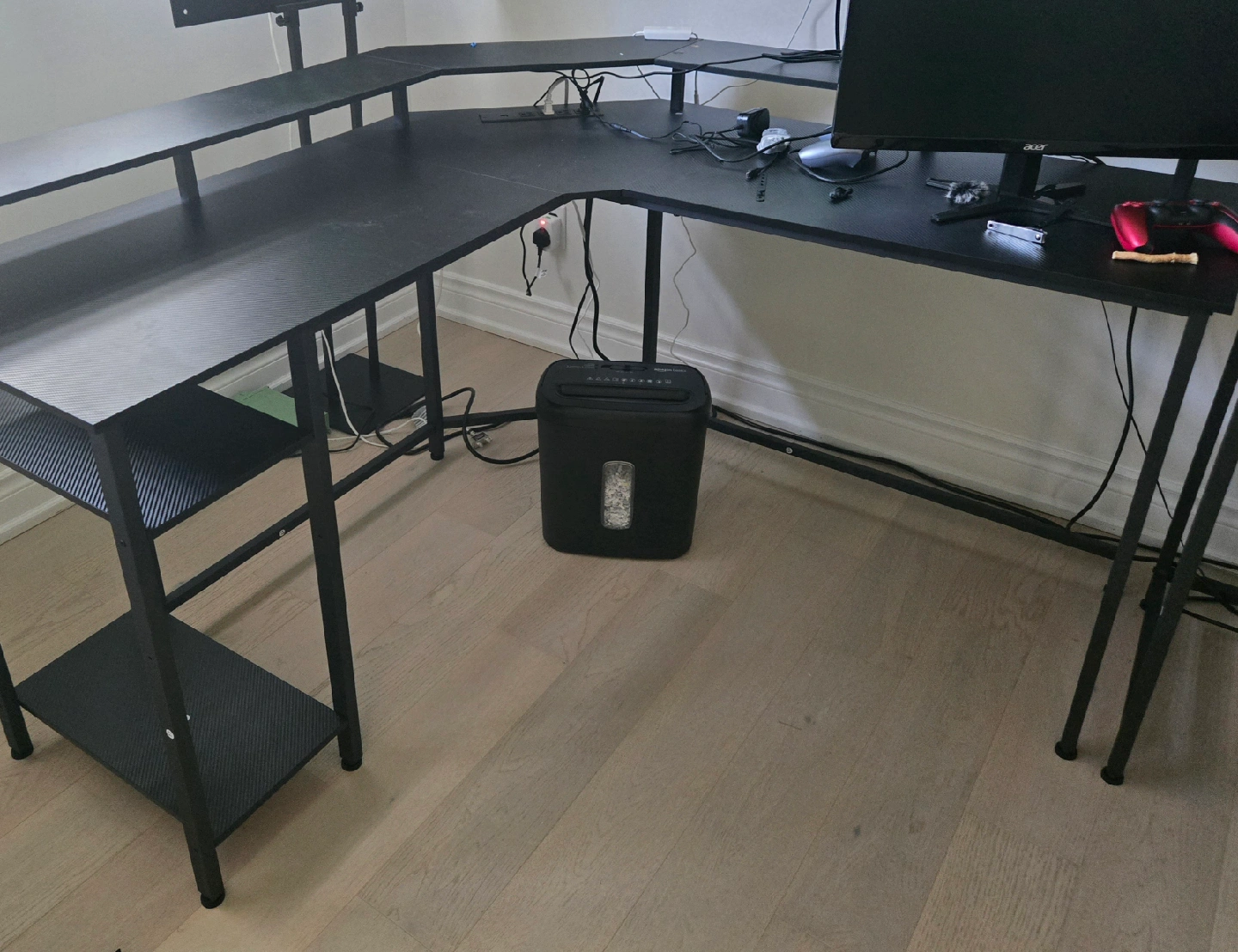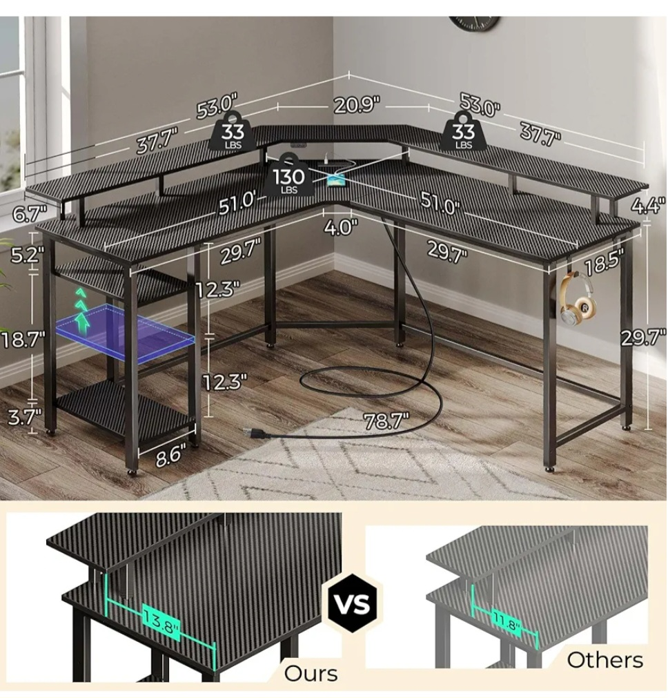 Looking to sell my L-shaped corner desk! It's a great setup for a home office or gaming station. The desk features built-in shelves for extra storage and organization. The dimensions are approximately 53" x 53" along the sides, with a depth of about 21". It's super sturdy and in great shape! Originally bought for $175!
