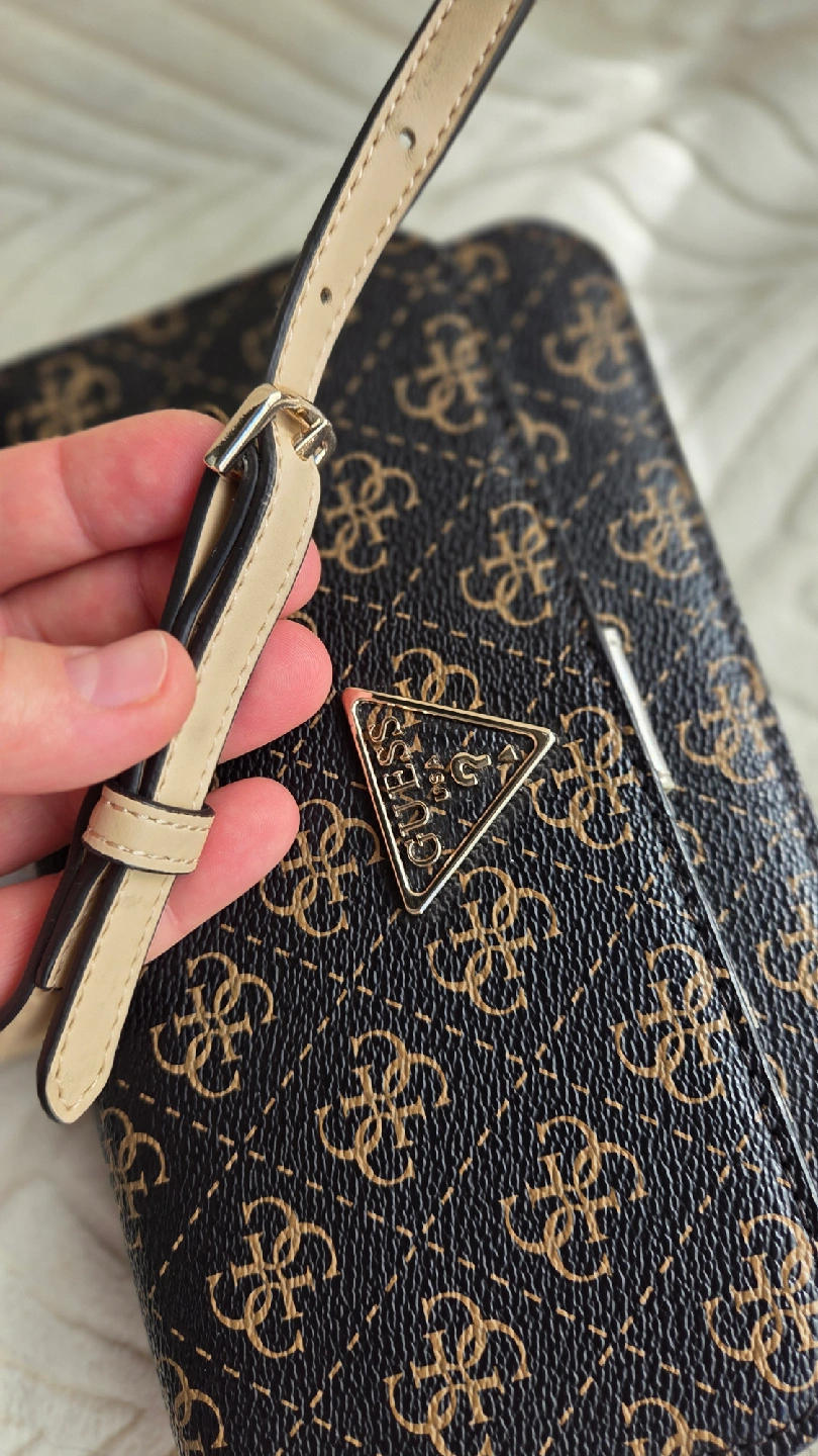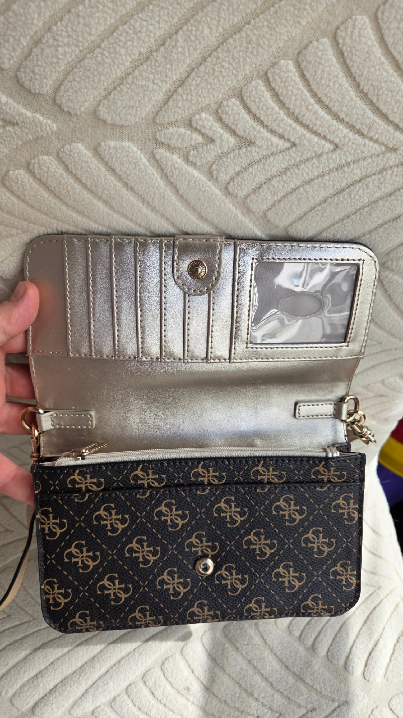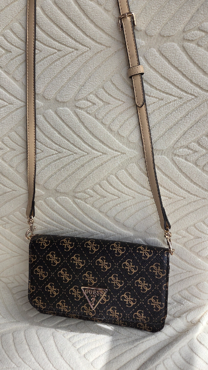 This is a Guess crossbody bag with a brown patterned design. It has a beige strap and gold-tone hardware. The interior features a zippered compartment and card slots. Perfect condition l.