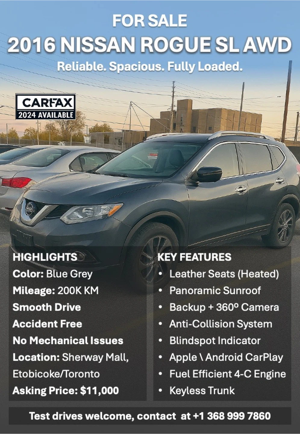 12Leaving Canada by end of November and hence selling my beloved car. Available from last week of November. Selling below market value. 200K km completed, not a single mechanical issue, no accident and never spent a single penny on any mechanical repair. 360° camera, front camera, automatic transmission, power windows, heated seats, panoramic sunroof and much more.