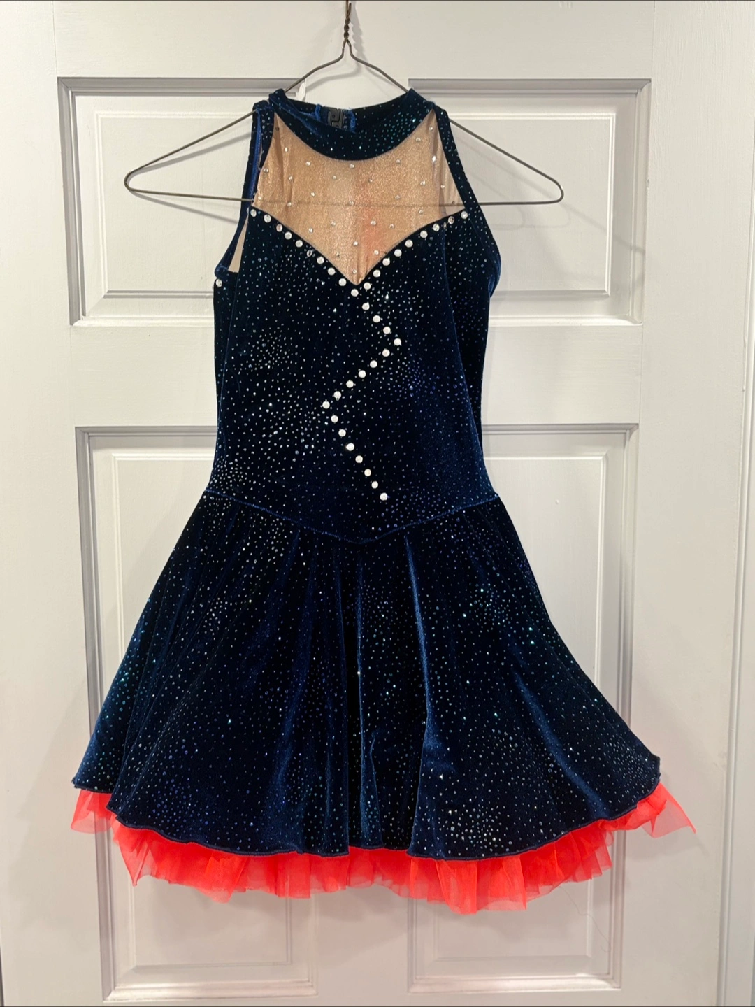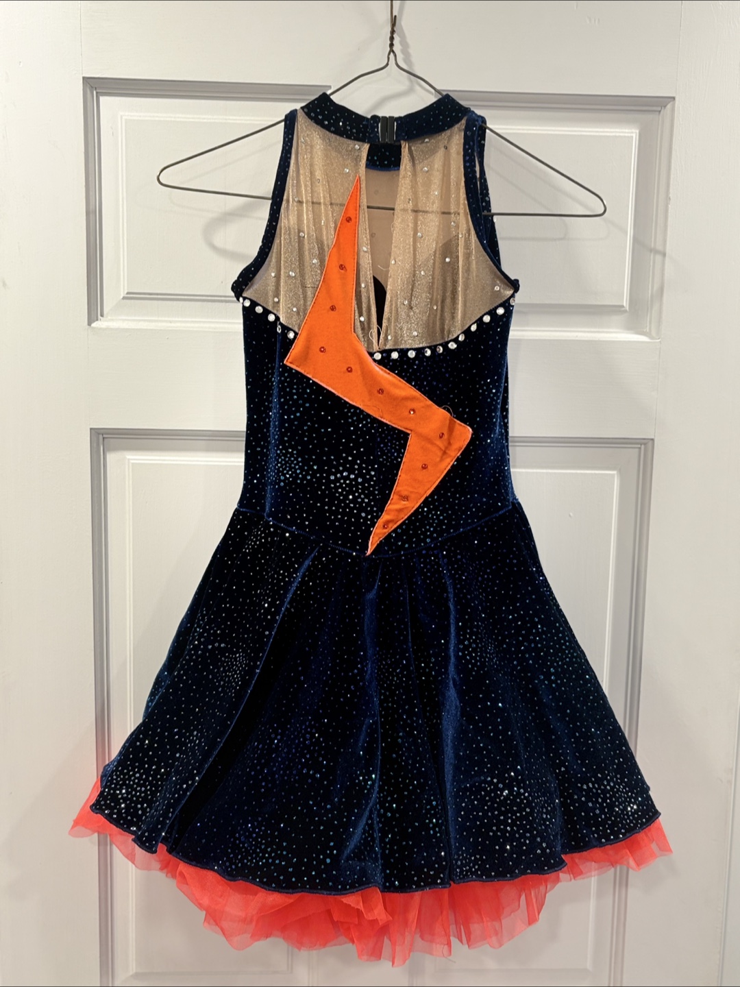 Selling a beautiful dance costume! It features a deep blue velvet bodice and skirt with sparkly embellishments. There's a fun orange lightning bolt design on the back and a playful orange tulle trim at the bottom. Perfect for your next performance!