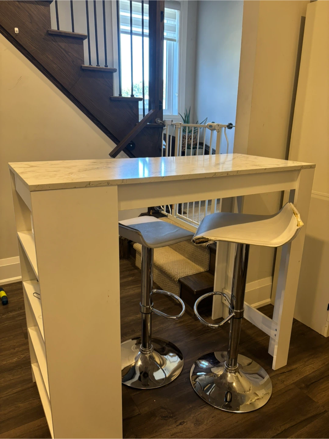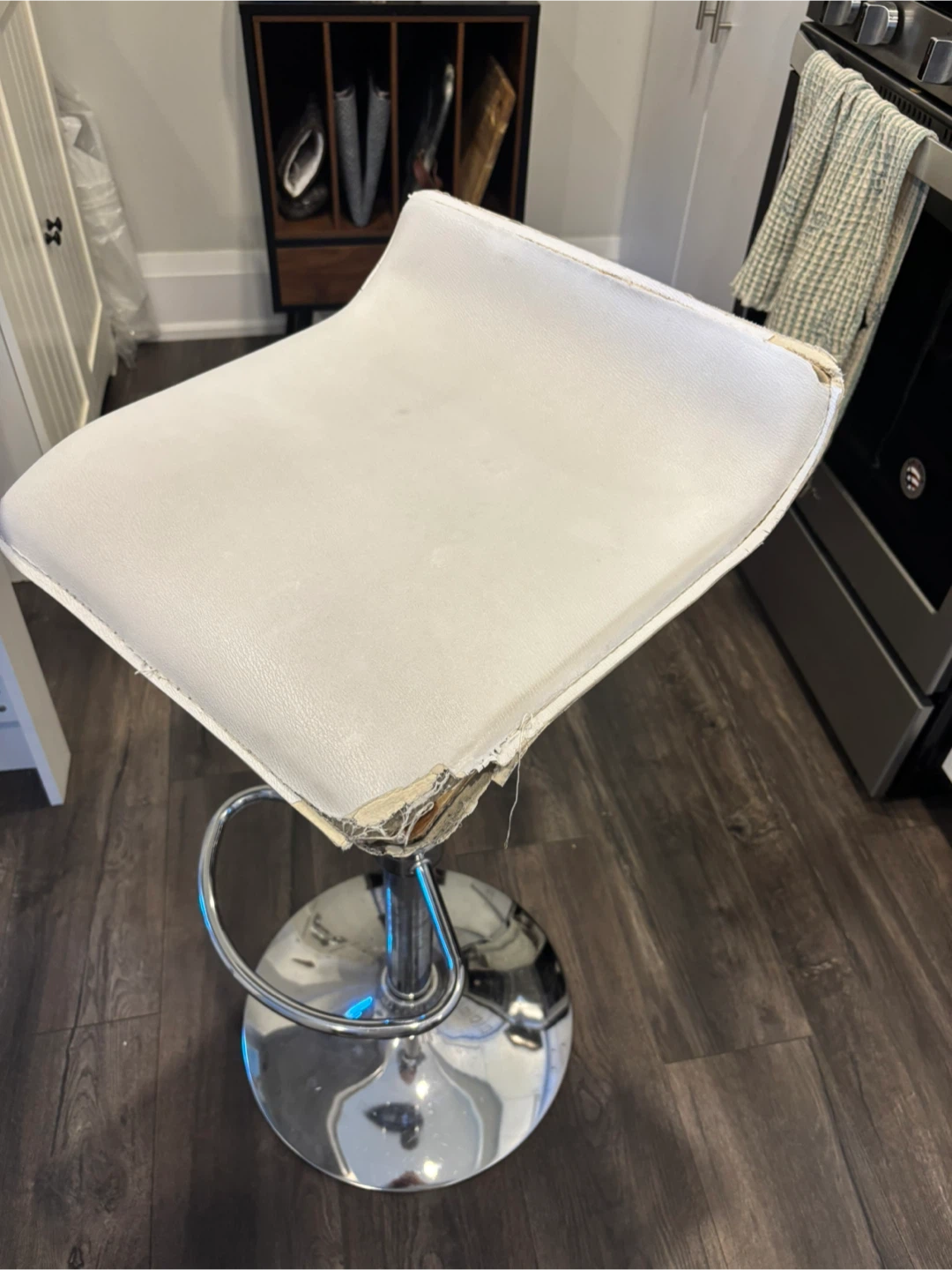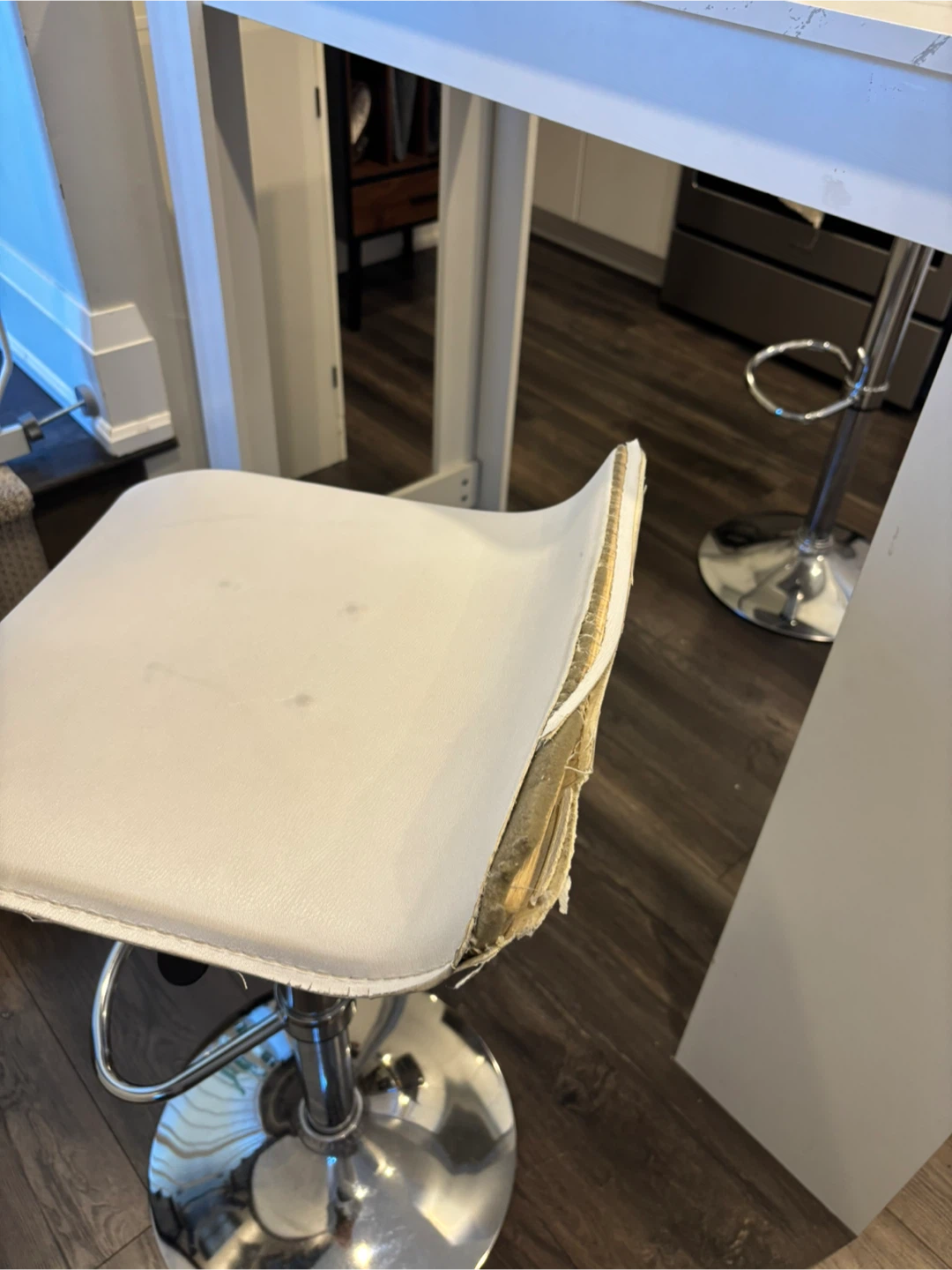 The bar stools are white with chrome bases. The seat of one of the stools is damaged & willthrow these in for free.