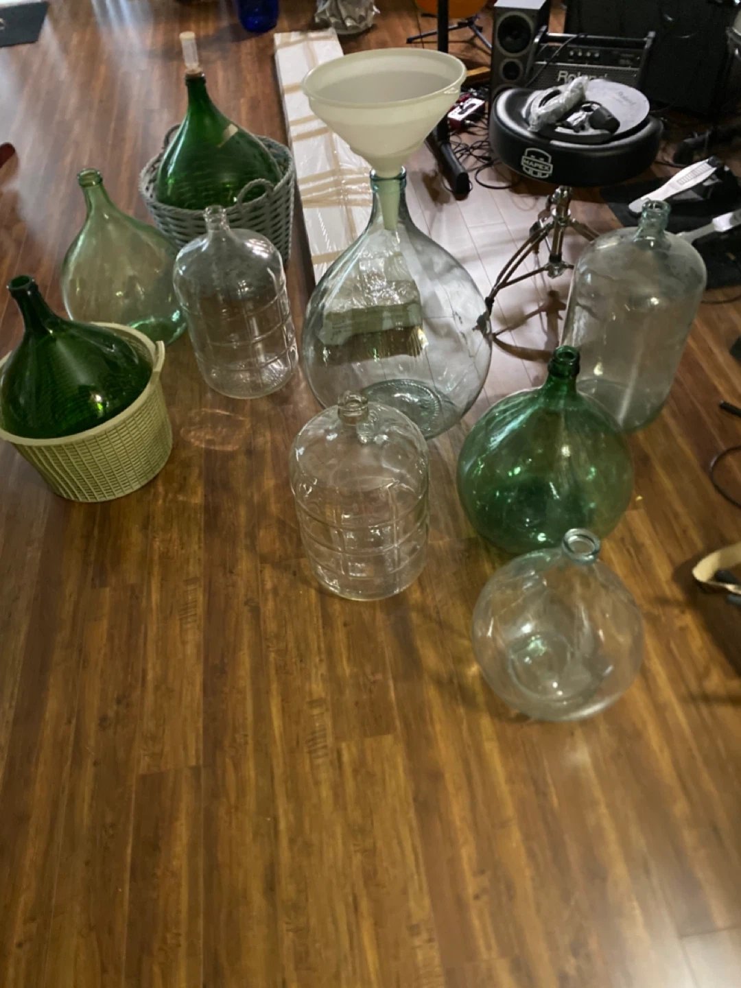 Selling a collection of glass demijohns in various sizes and shades of green and clear.