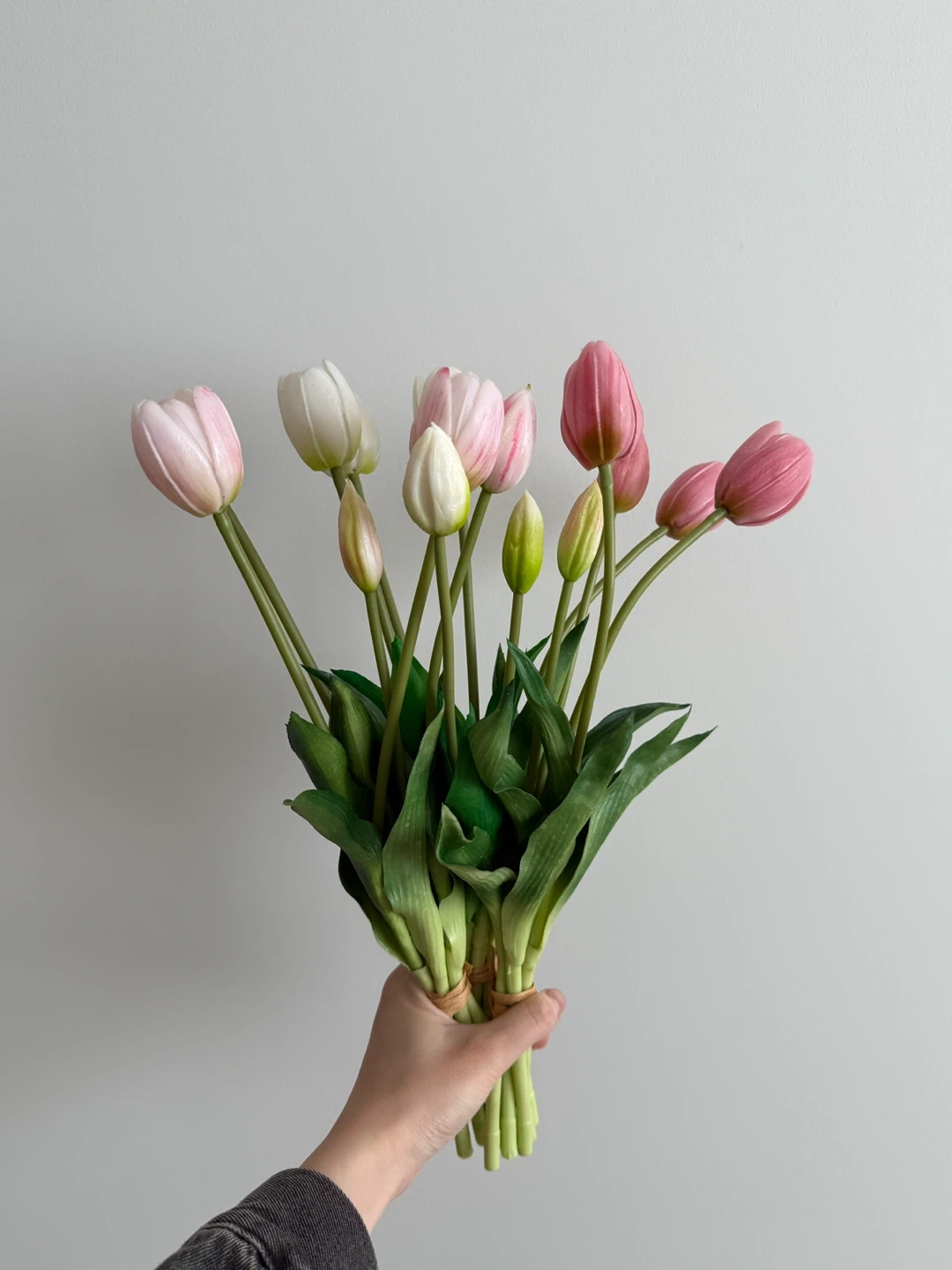 Add a touch of spring to your home with this lovely artificial tulip bouquet! The bouquet features a mix of pink and white tulips, perfect for brightening up any room. These faux flowers are great for adding a pop of colour without the hassle of real plants