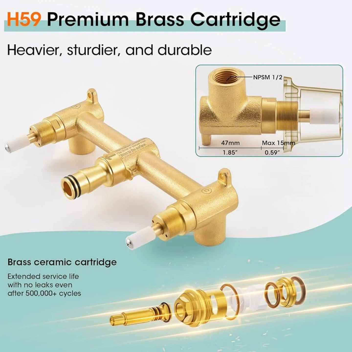 Selling a wall mount tub faucet with a sleek matte black and brass finish! This set includes: - Installation gloves x2 - Installation instructions x1 - Main faucet x1 - Handles x2 - Spout x1 - Teflon tape x1 - ABS aerator key x1 - Allen wrench x1 - Screws and anchors - O-rings The spout has an extra long reach of 10.33 inches, and it can fill a 60-gallon tub in just 6 minutes!