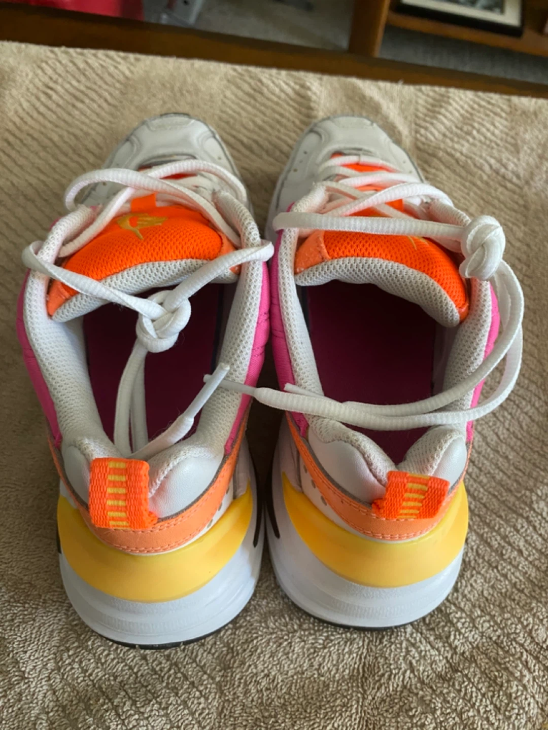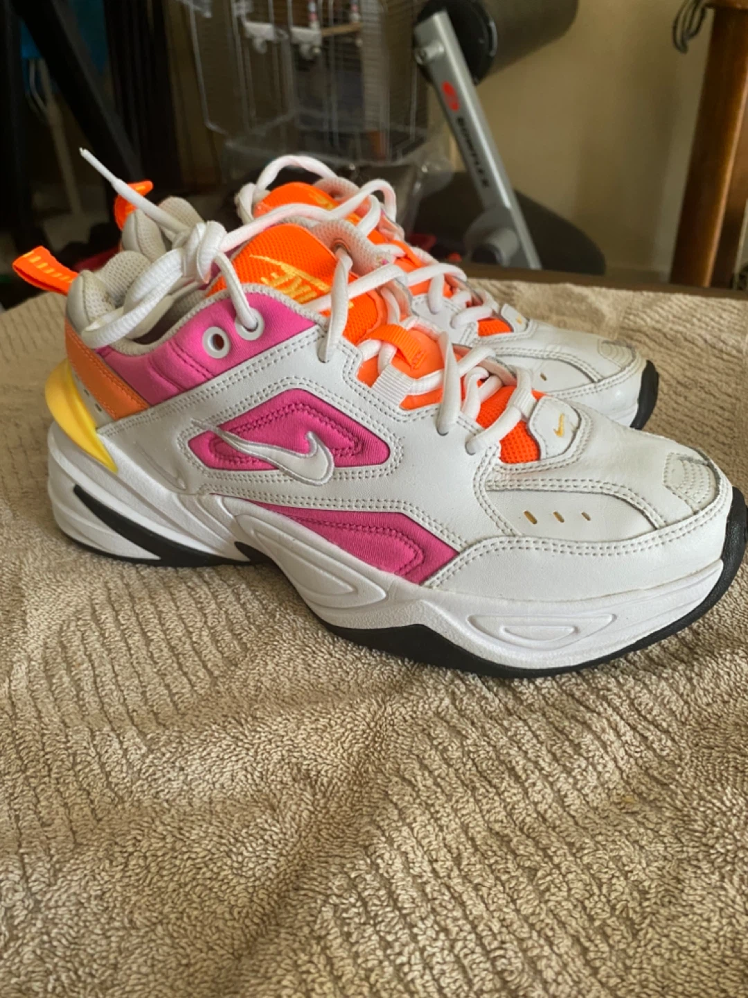 Selling a pair of Nike M2K Tekno sneakers SIZE 7, in a vibrant white, pink, and orange colourway! These shoes are in MINT NEAR NEW STORE CONDITION, WORN ONCE INDOOR.