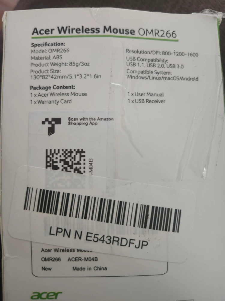 Selling a brand new Acer Wireless Mouse, model OMR266! It's still in its original packaging.