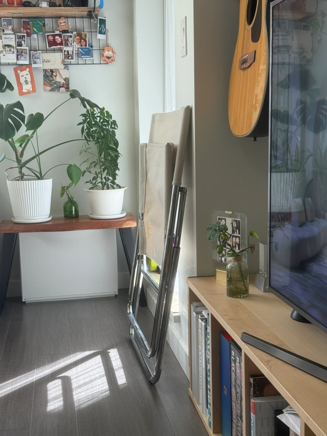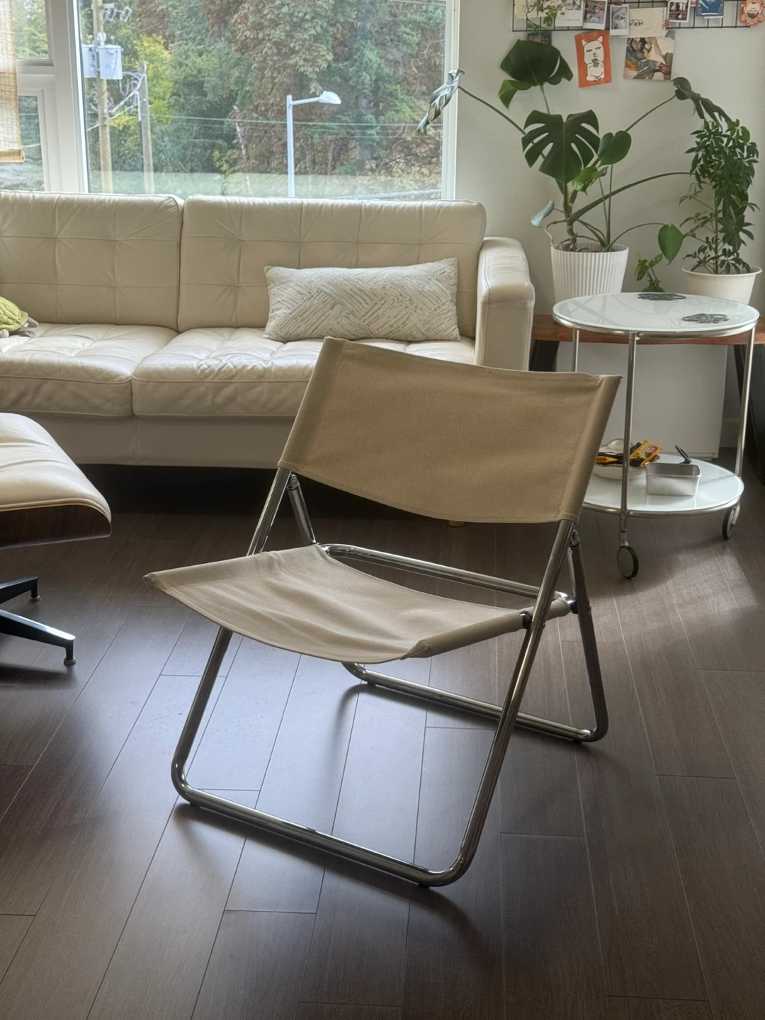 Selling a cute folding chair with a beige canvas seat and back. It's in great condition and perfect for extra seating when you have guests over. The frame is chrome.