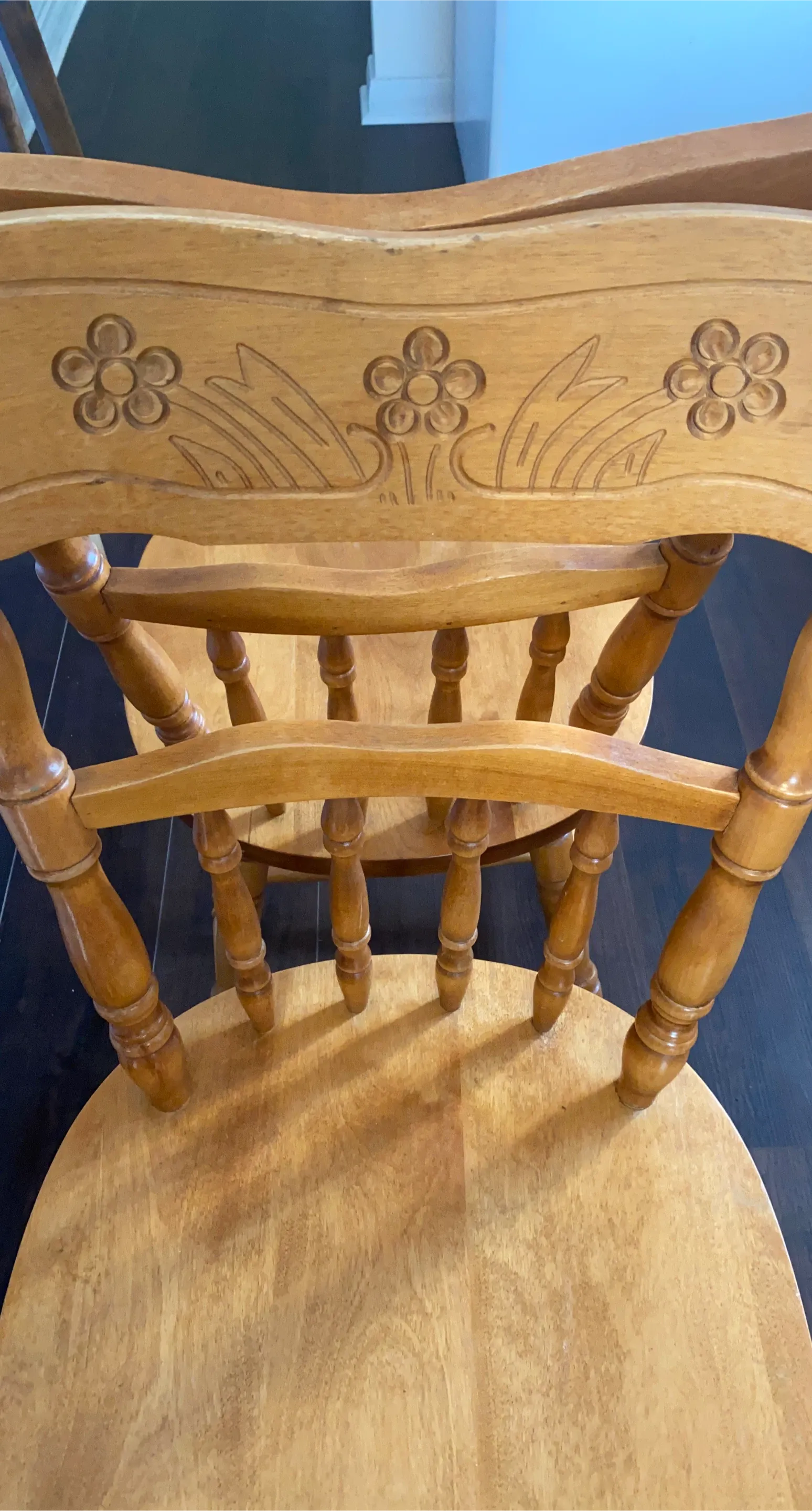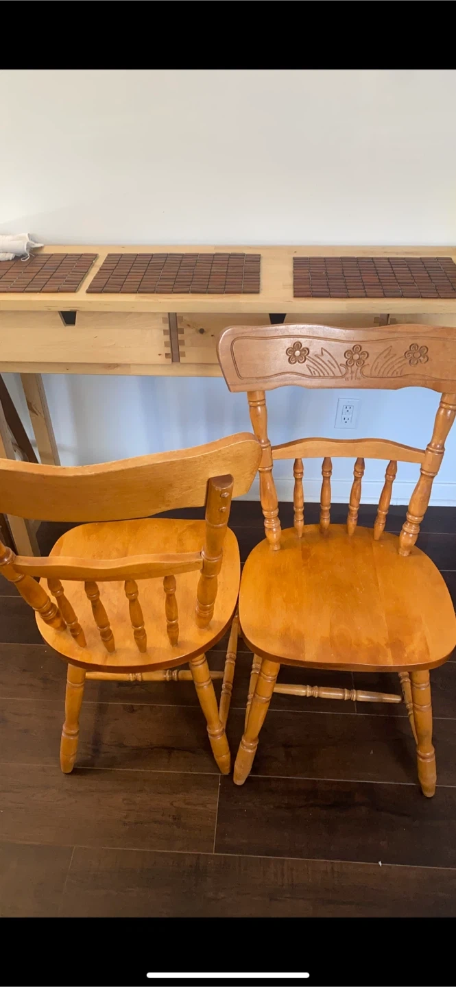 Selling a set of two wooden dining chairs. They have a cute floral design carved into the back. Perfect for adding a touch of charm to your dining area!