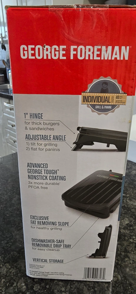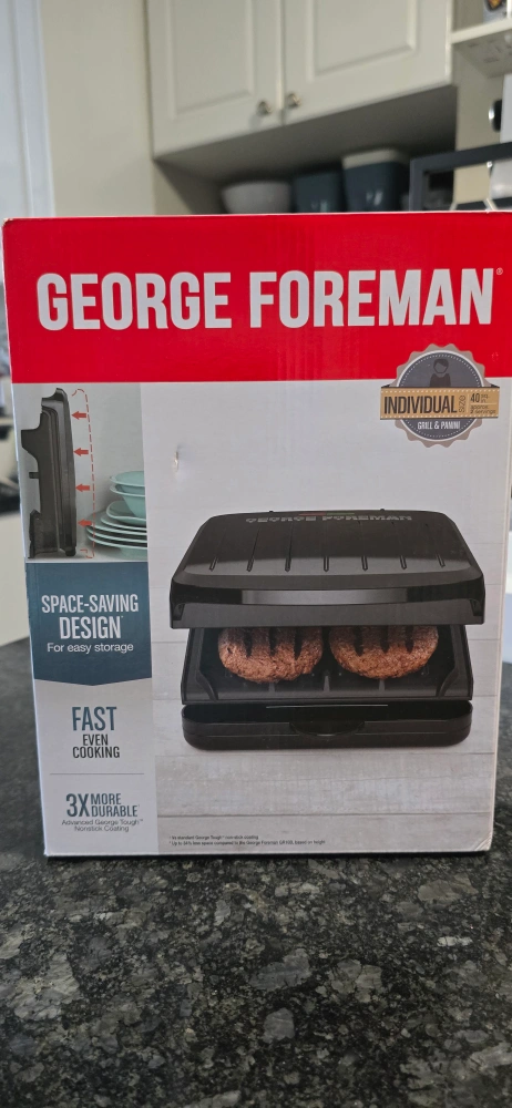 I'm selling a George Foreman Individual Grill & Panini press! It's perfect for making thick burgers and sandwiches. It features an adjustable angle for grilling or making paninis. The advanced George Tough nonstick coating is 3x more durable and PFOA free. It also has an exclusive fat-removing slope for healthy grilling and a dishwasher-safe removable drip tray for easy cleanup! The grill also has vertical storage for saving space