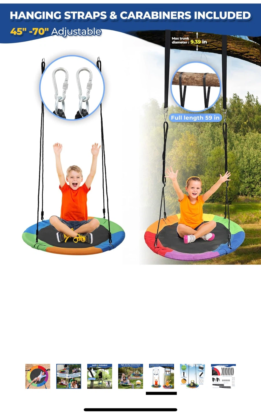 Get ready for some outdoor fun with this adjustable tree swing! It comes with hanging straps and carabiners included, making it easy to set up. 40 Inch Saucer Swing with 9mm Thickness Tree Swing up to 700lb Weight for Kids Adults, Backyard and Playroom.
