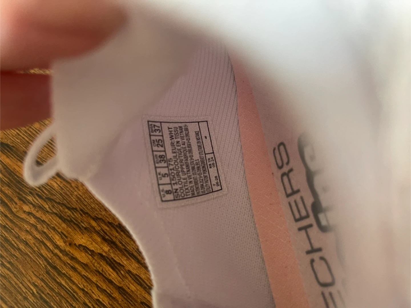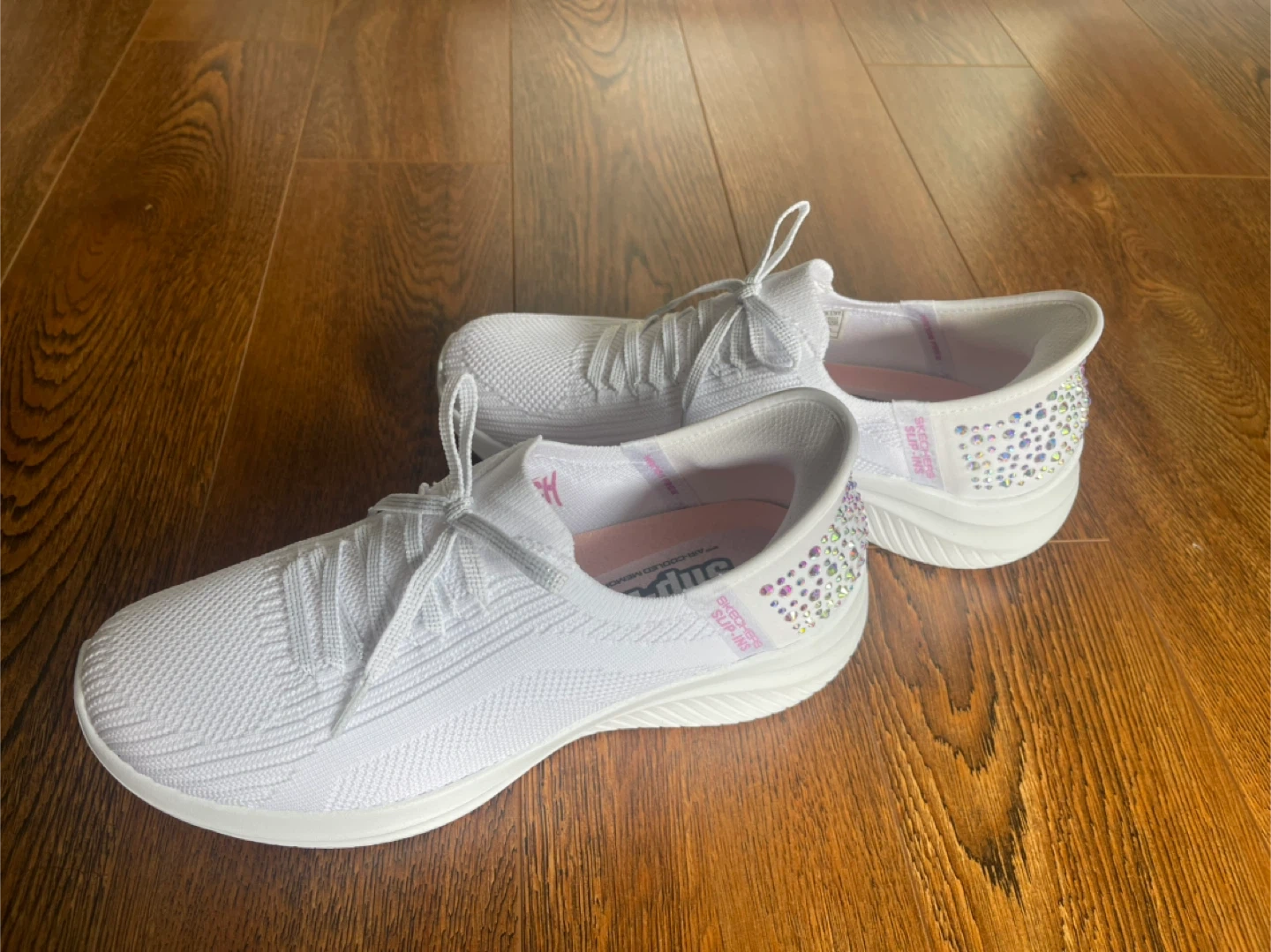 Selling a pair of Skechers Slip-ins in white! They're a women's size 8. These shoes feature a comfortable, slip-on design with a stretch fit. The back of the shoes have rhinestone detailing, adding a bit of sparkle to your step!