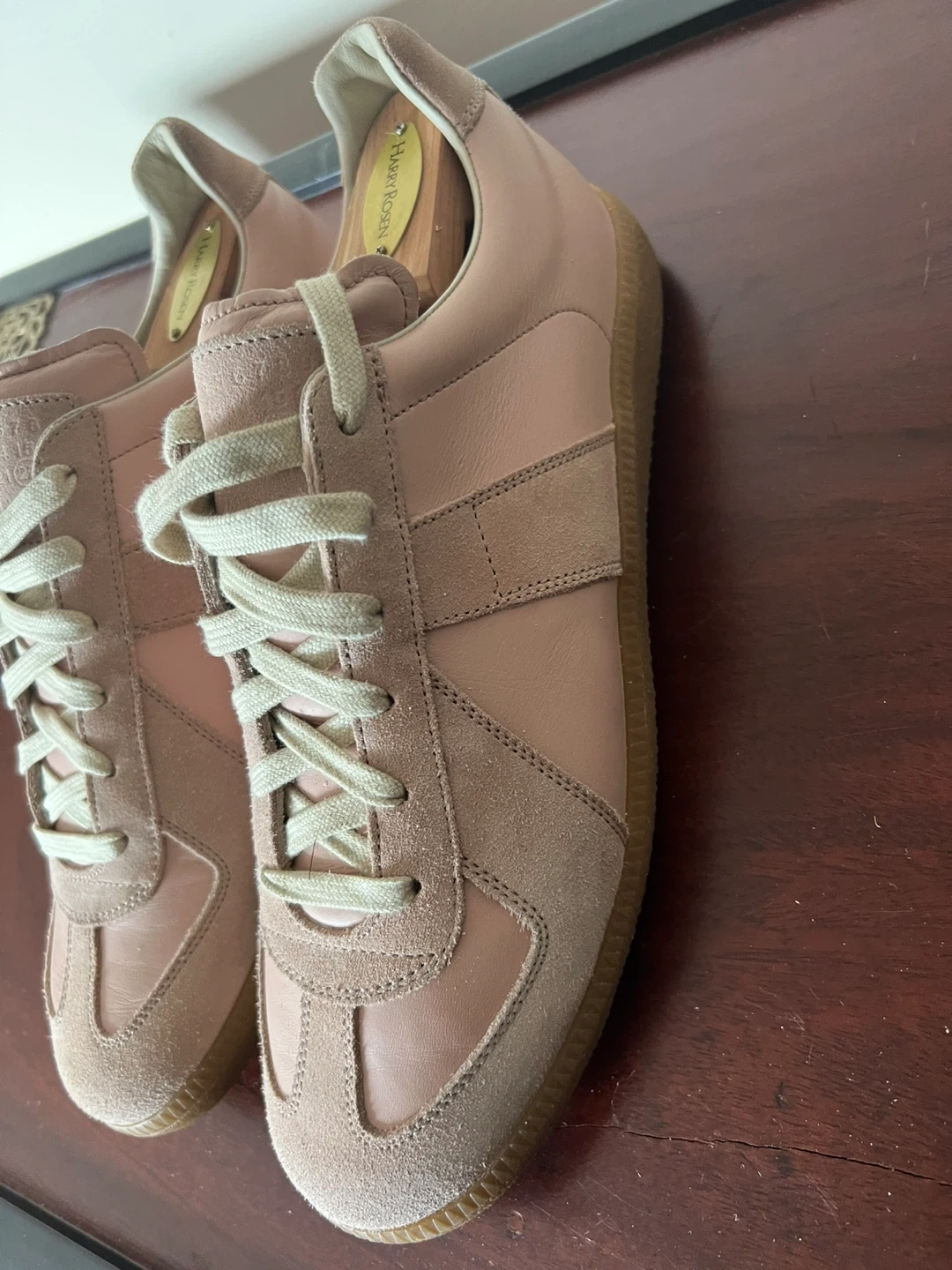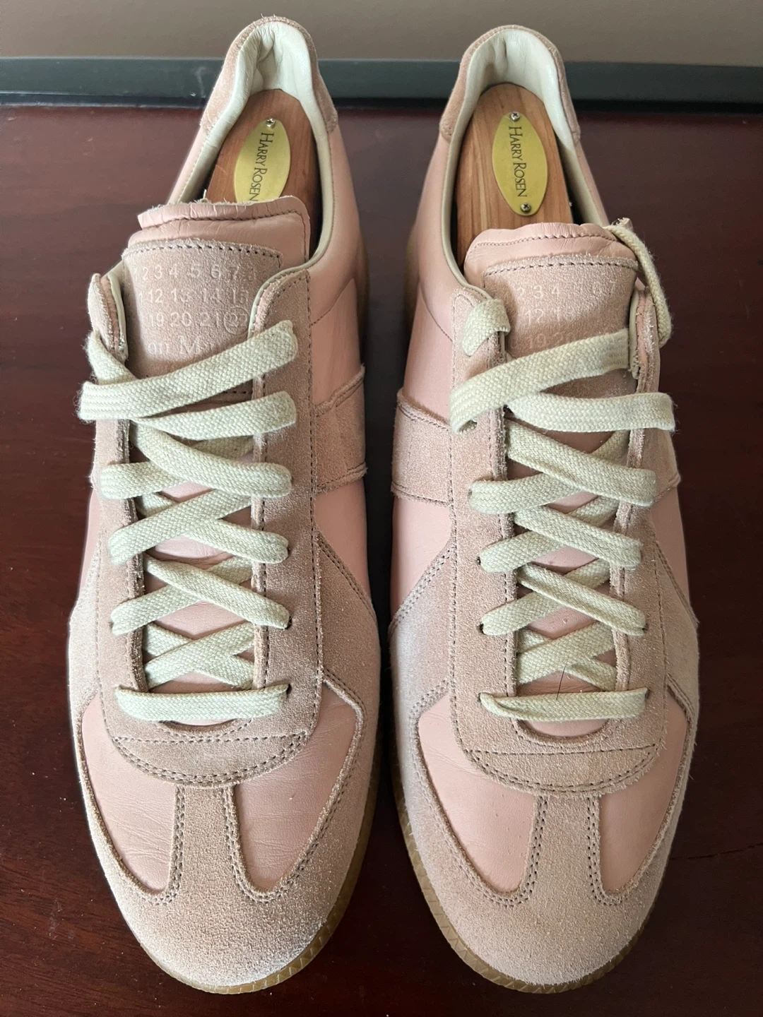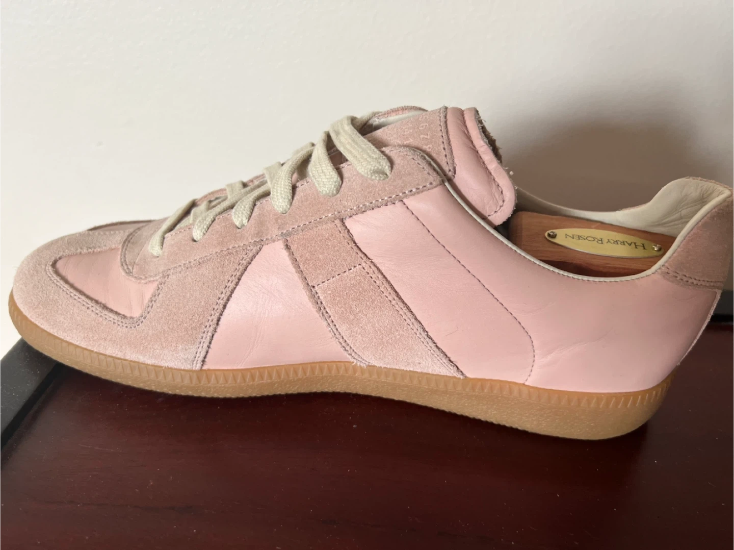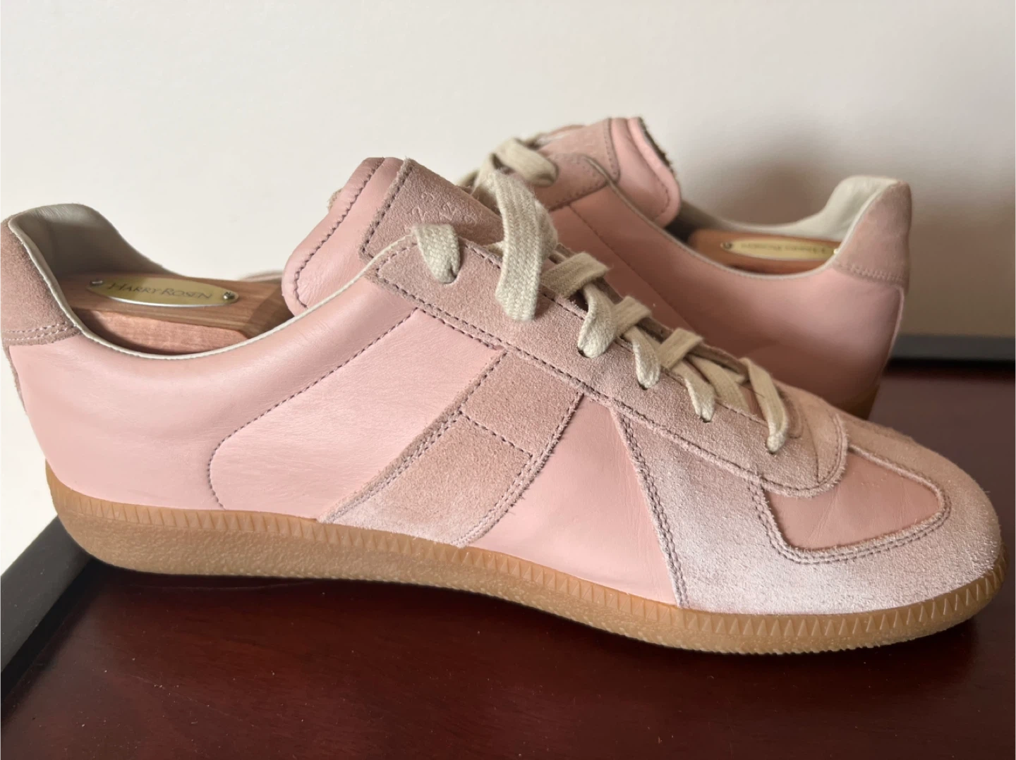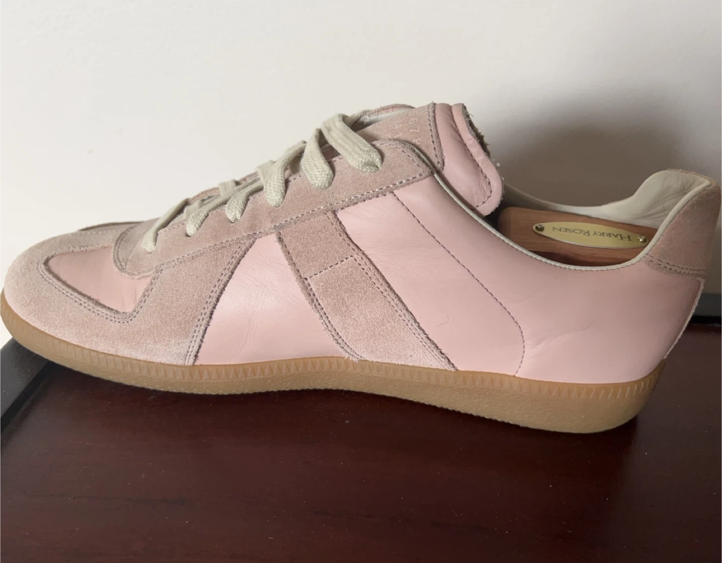 Selling a pair of Maison Margiela sneakers in a lovely pink colour! These are in new & never worn condition. Perfect for adding a touch of understated cool to your wardrobe. They feature a classic design with a mix of leather and suede.