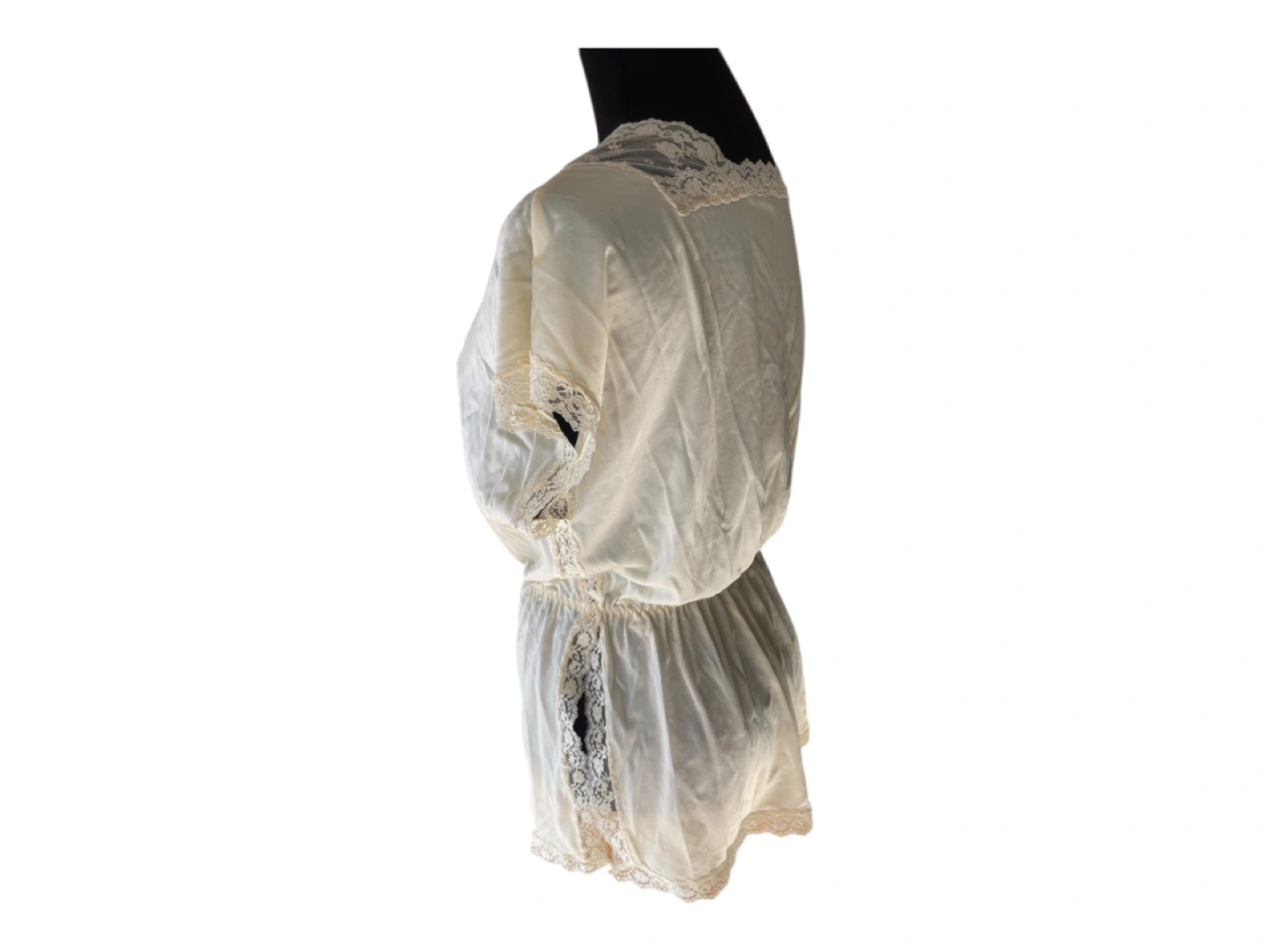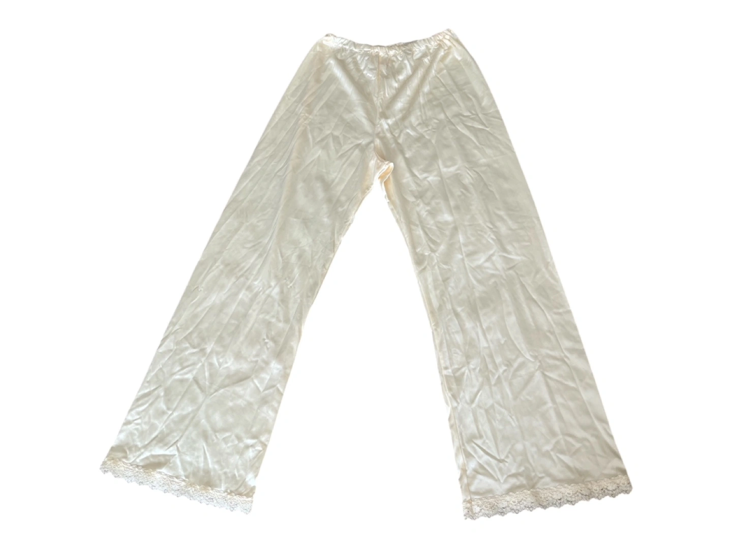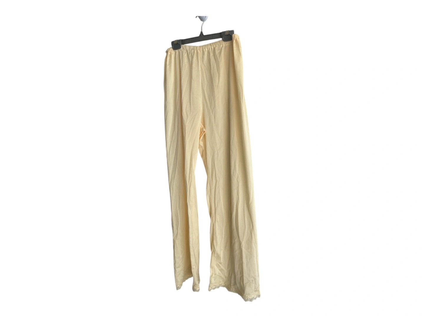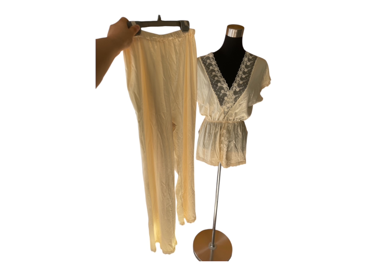 Vintage 80s/90s Cream Yellow Floral Lace Trim & Embroidery Matching Set Flared Pants & Babydoll Top S/M