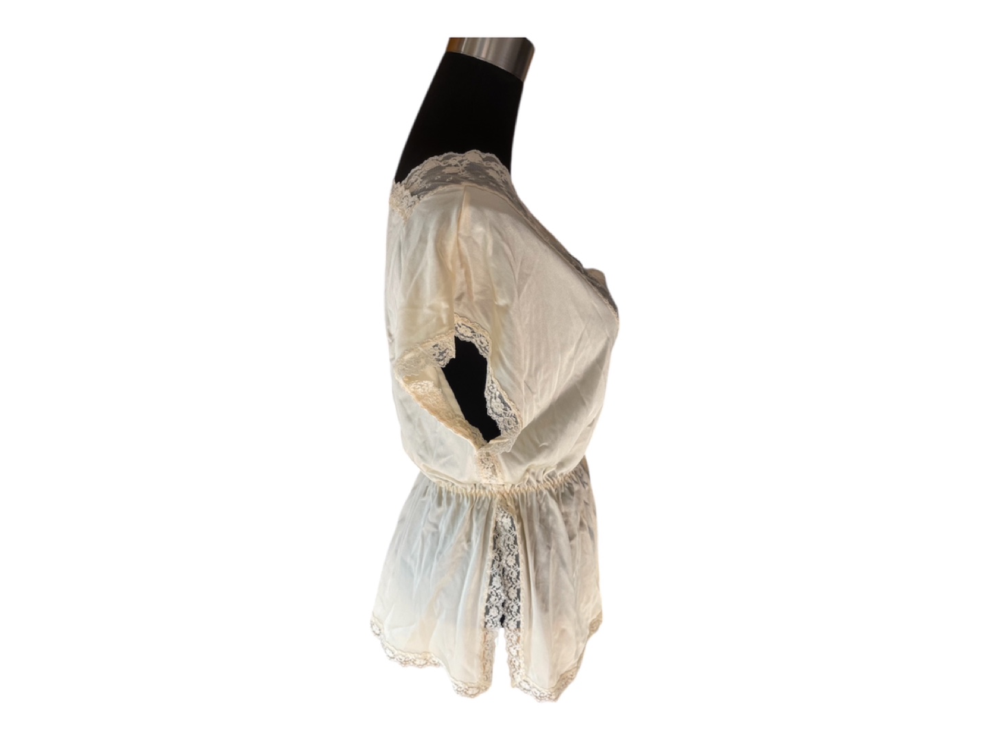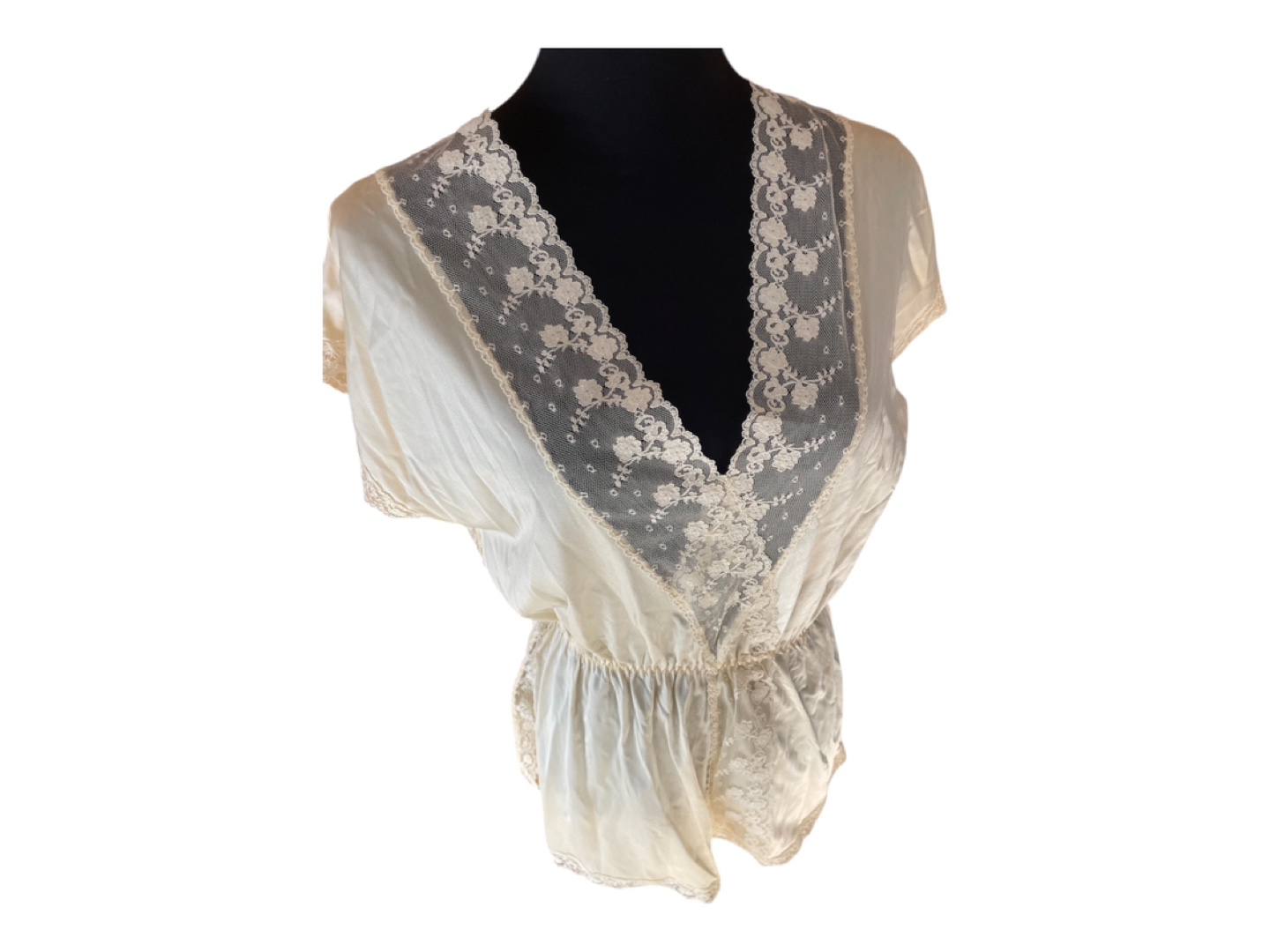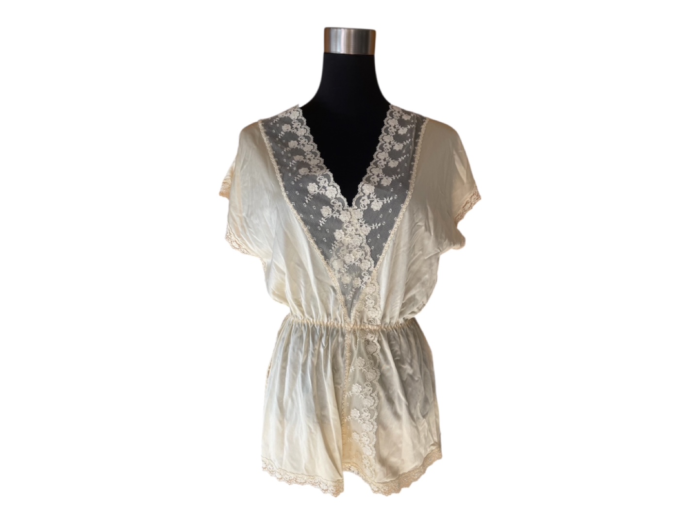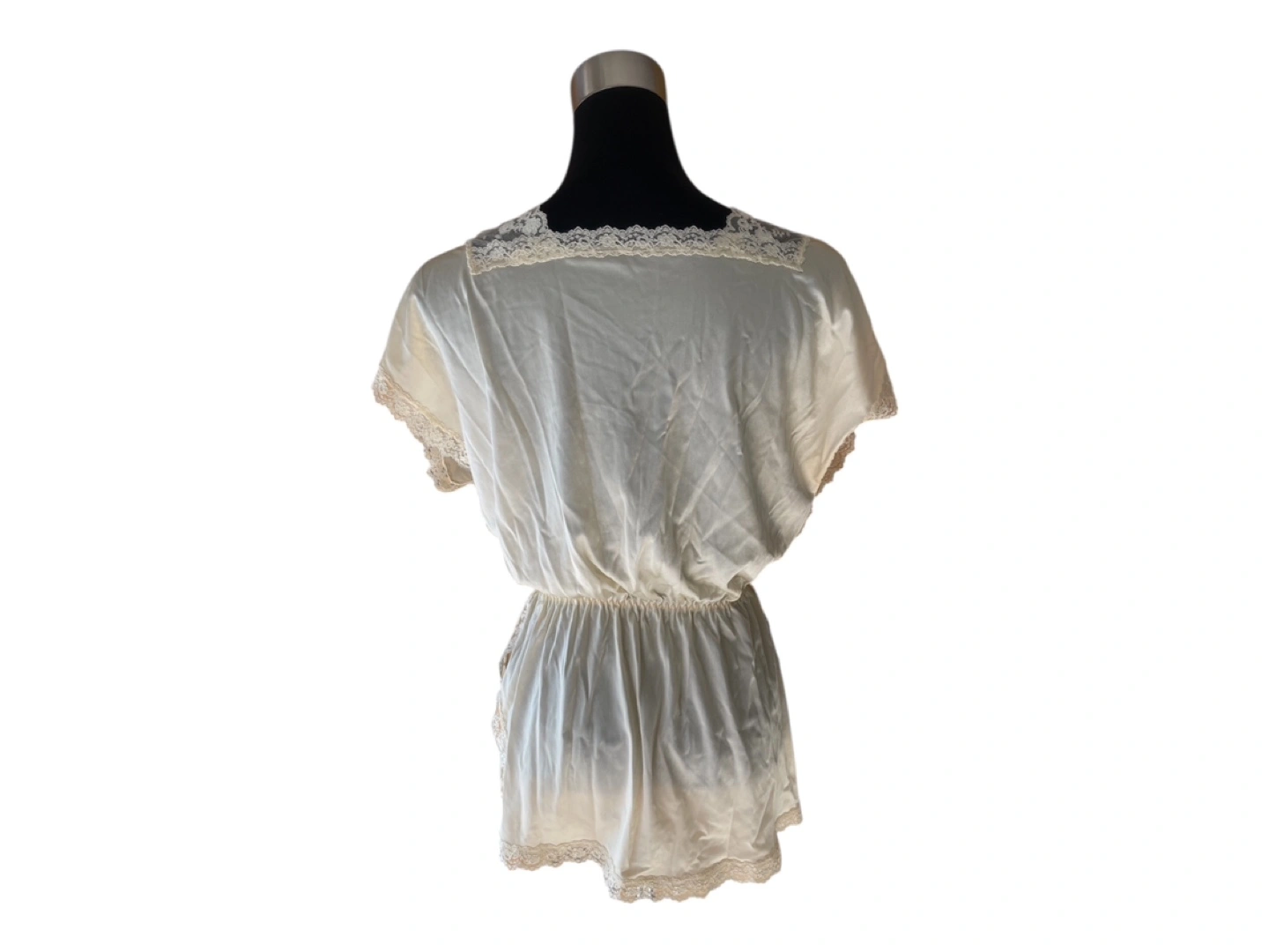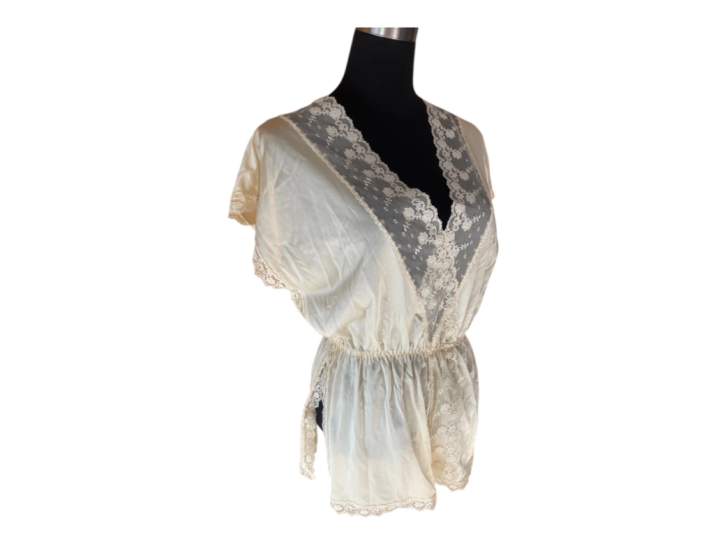 Vintage 80s/90s Cream Yellow Floral Lace Trim & Embroidery Matching Set Flared Pants & Babydoll Top S/M