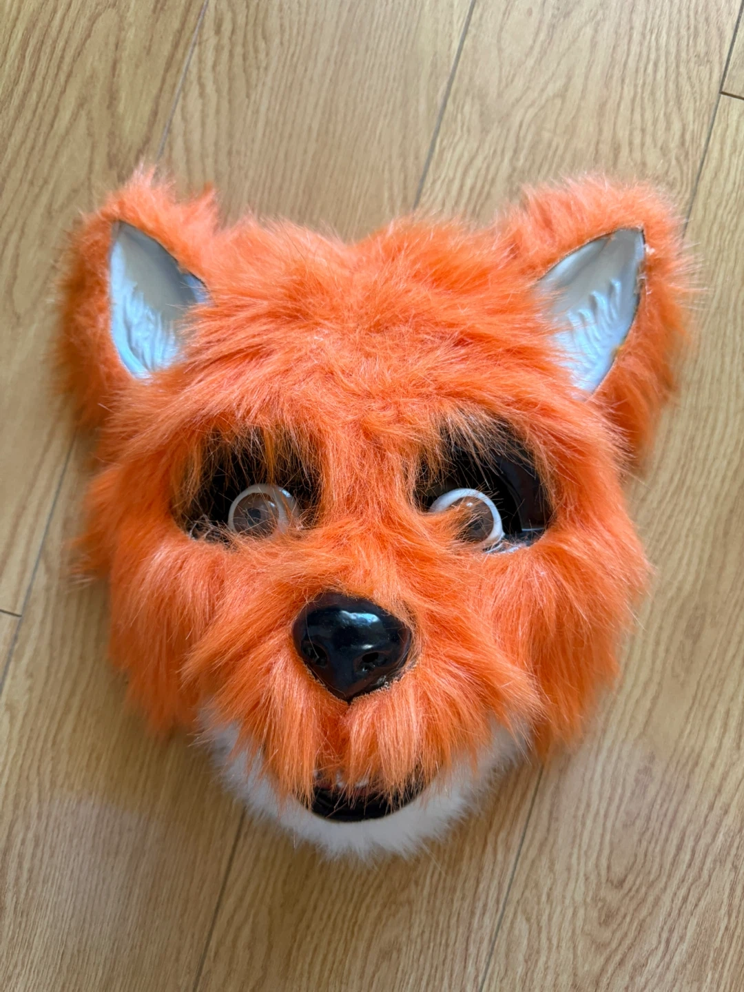 orange fox Halloween mask! in perfect condition and perfect for costumes or dress-up. It features orange faux fur and a black plastic base with an elastic strap for a secure fit.