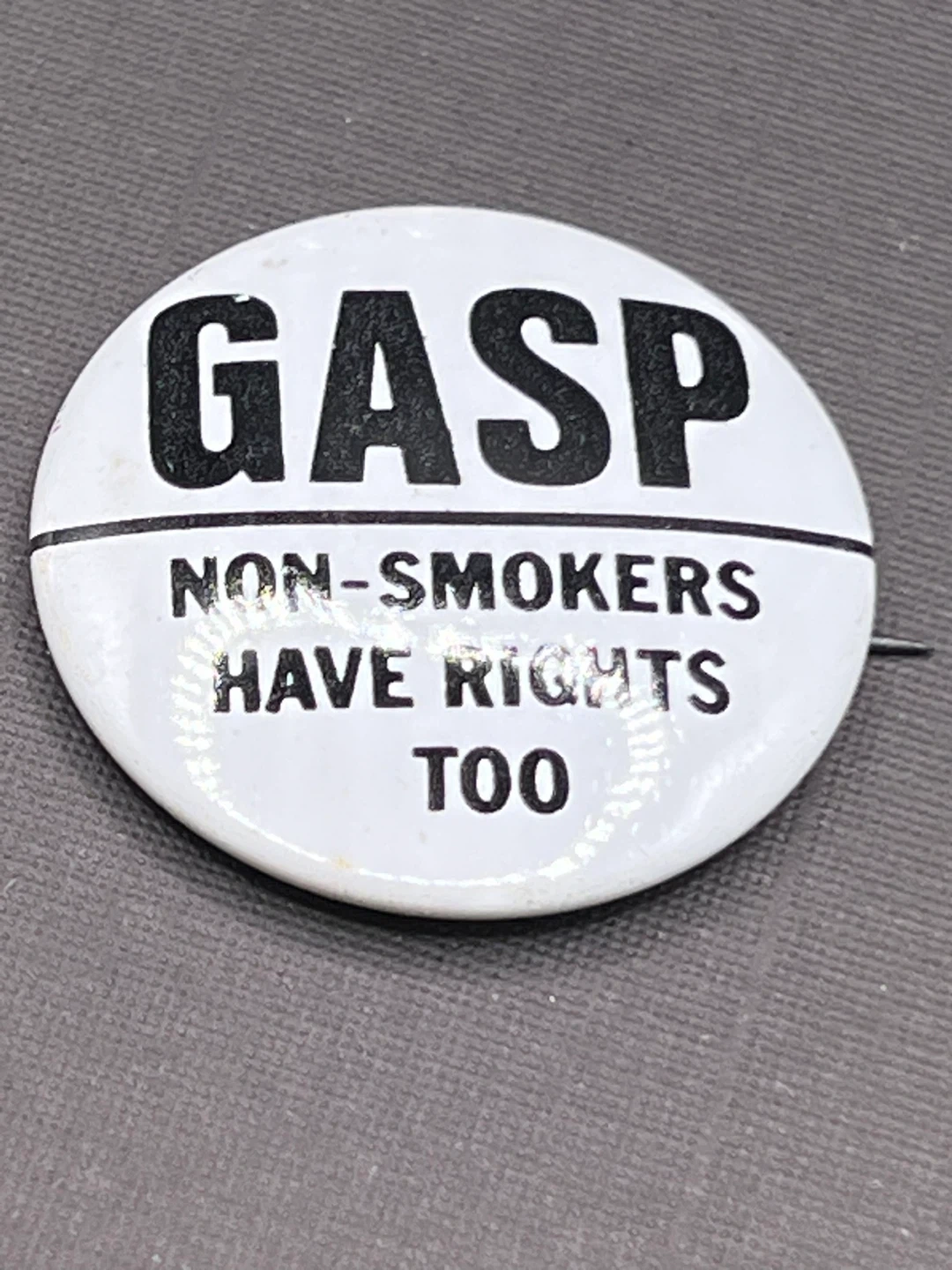 Here is a vintage "Thank You For Not Smoking" sign by Papel. It is made in Japan and is in good condition. Also included is a GASP non-smokers have rights too button