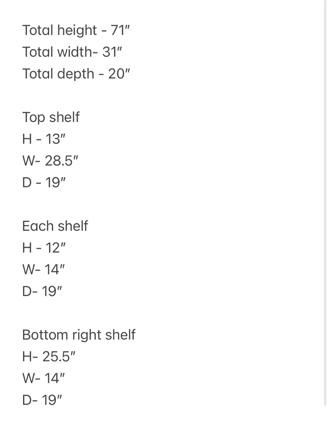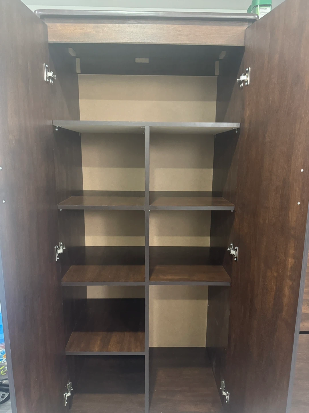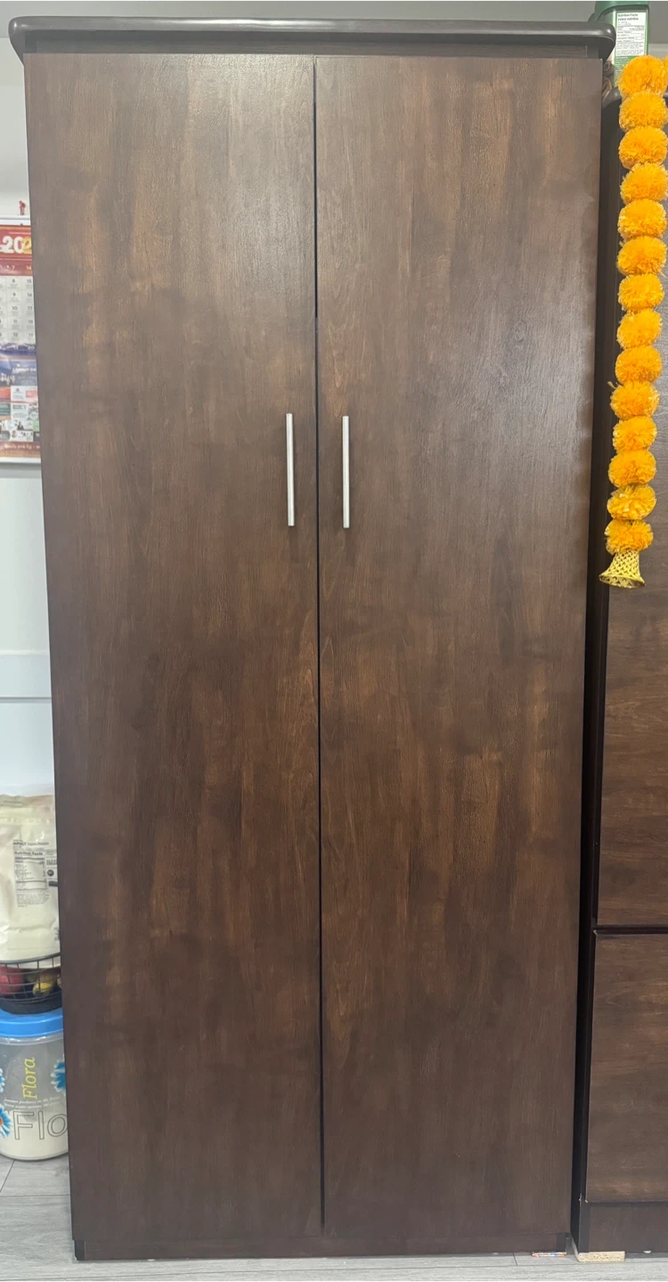 Selling a dark brown wooden wardrobe in great condition! The wardrobe has two doors and several shelves. Dimensions: - Total height: 71" - Total width: 31" - Total depth: 20" Top Shelf: - Height: 13" - Width: 28.5" - Depth: 19" Each Shelf: - Height: 12" - Width: 14" - Depth: 19" Bottom Right Shelf: - Height: 25.5" - Width: 14" - Depth: 19"