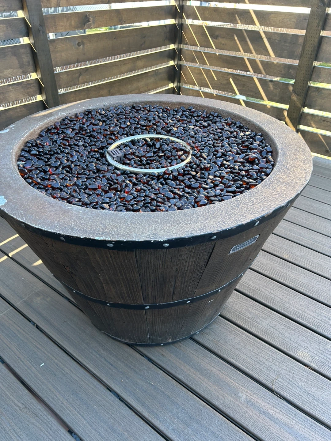 Selling a barrel-style fire pit, perfect for those cool evenings! It comes with a cover to protect it from the elements and is filled with fire glass for a cozy ambiance