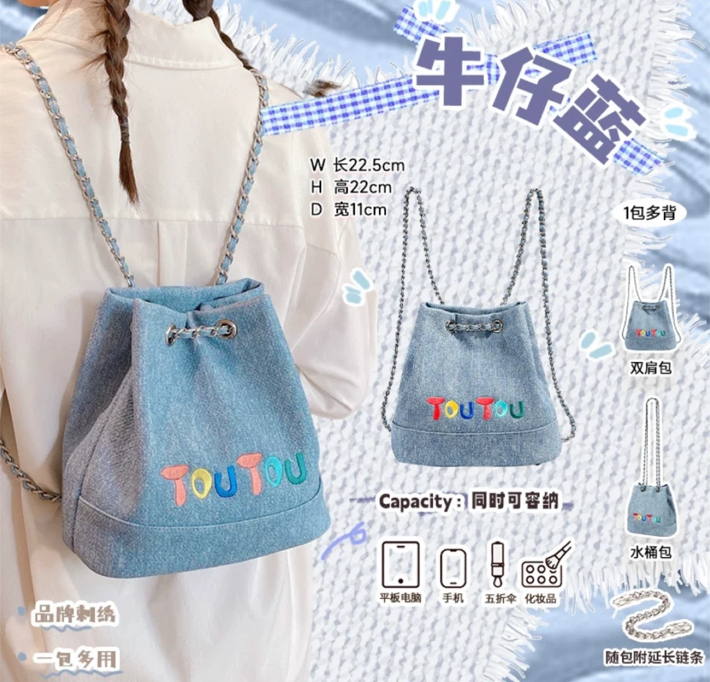 Check out this cute denim bucket bag! It features colourful 'TOUTOU' embroidery and can be worn multiple ways.