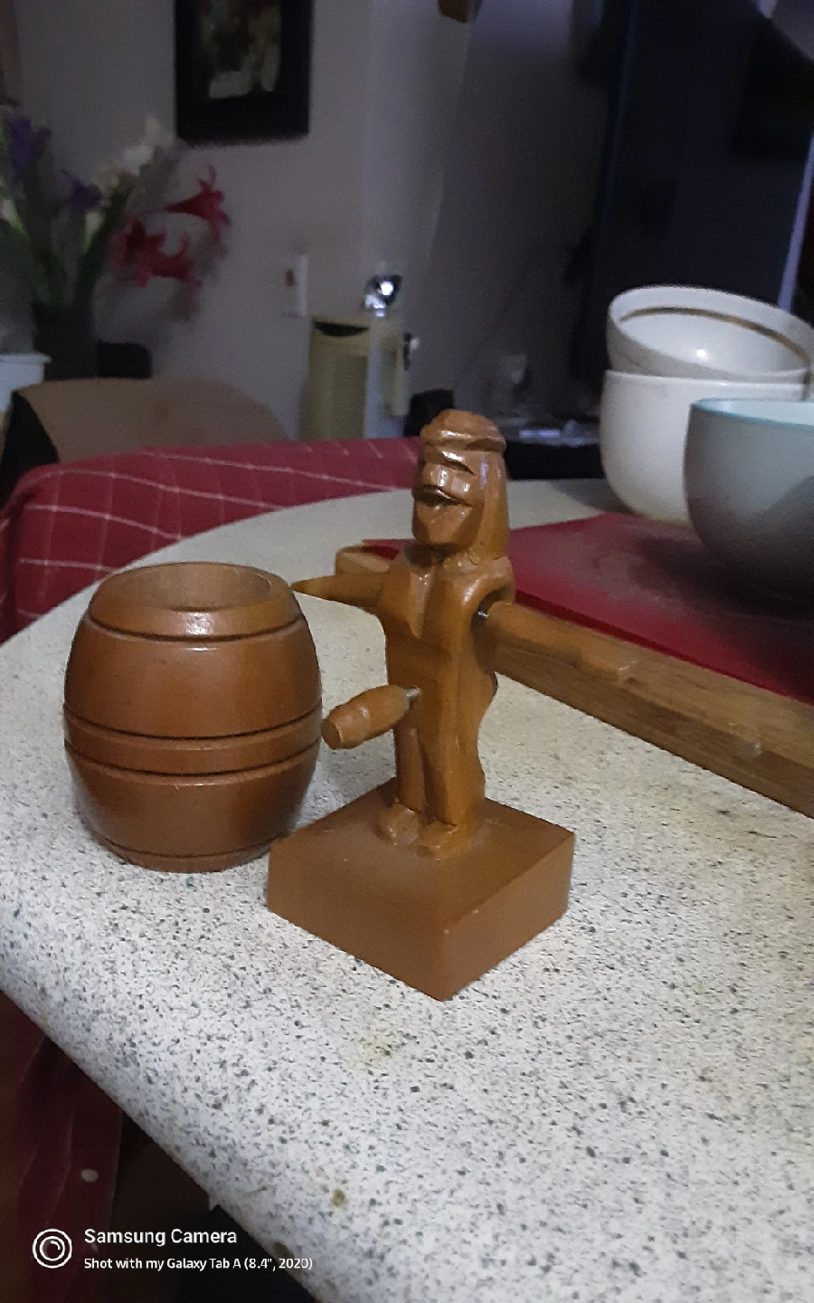 Here's a charming wooden toy featuring a man inside a barrel. It's in great condition and would make a lovely addition to any collection or a fun toy ....