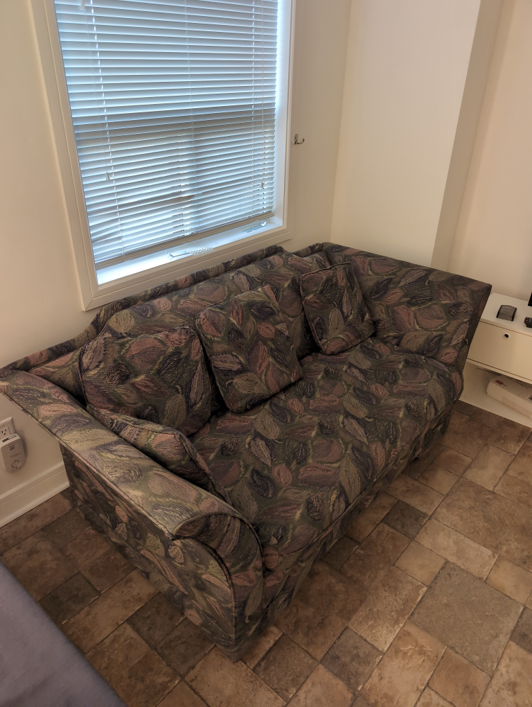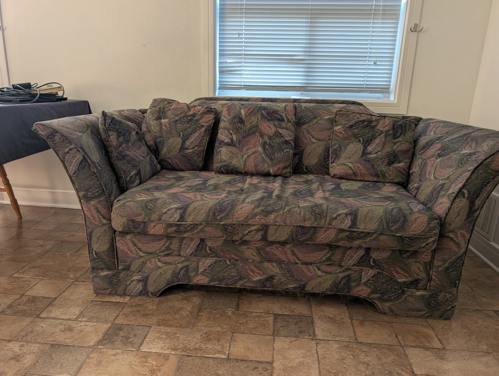 Comfortable sofa with a unique leaf pattern. It's in great condition and ready for a new home! Perfect for a living room or den.