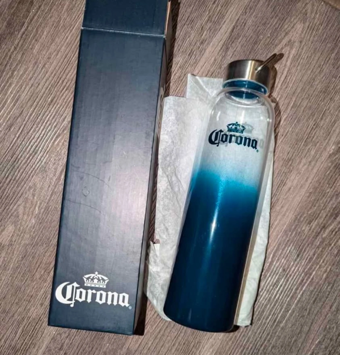 Selling a Corona water bottle featuring a cool blue ombre design. It comes with its original box, making it a great gift for a Corona fan or a stylish addition to your own collection