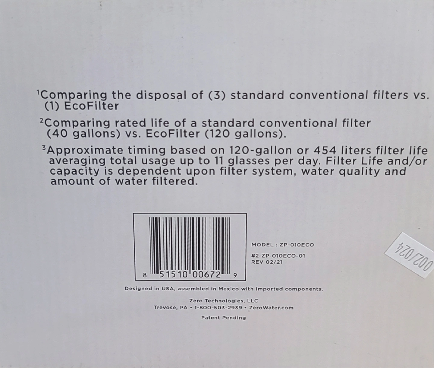 10 Cup Pitcher / 2.7 Liters. EcoFilter from ZeroWater. Comes with filter. Brand new, box has not been opened. I have one that I've used for 3 years. I paid 35.00 each for them.
