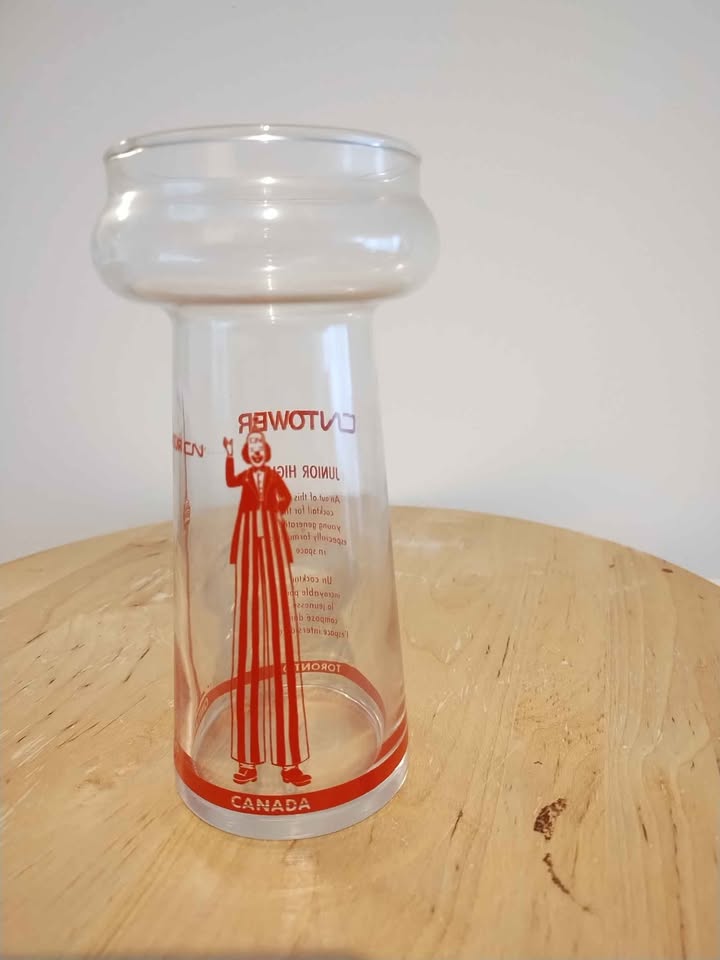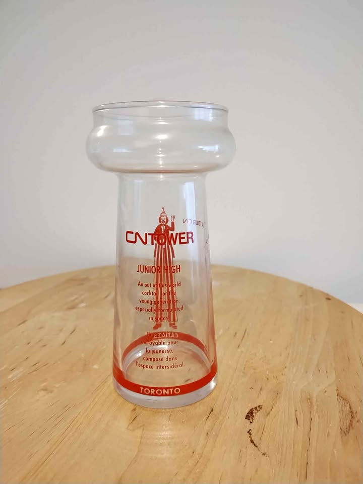 The shape of the glass is a replica of the CN Tower, its plastic spiked dome has been lost. The glass is 6½ inches tall. Meet up at Main Street Subway Station or Danforth GO Station.