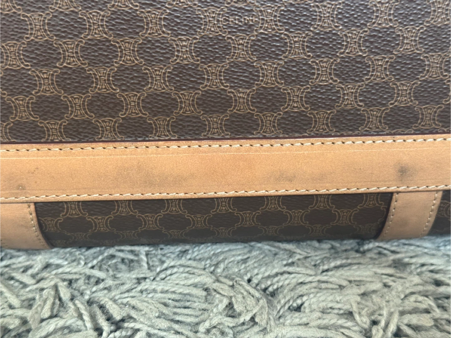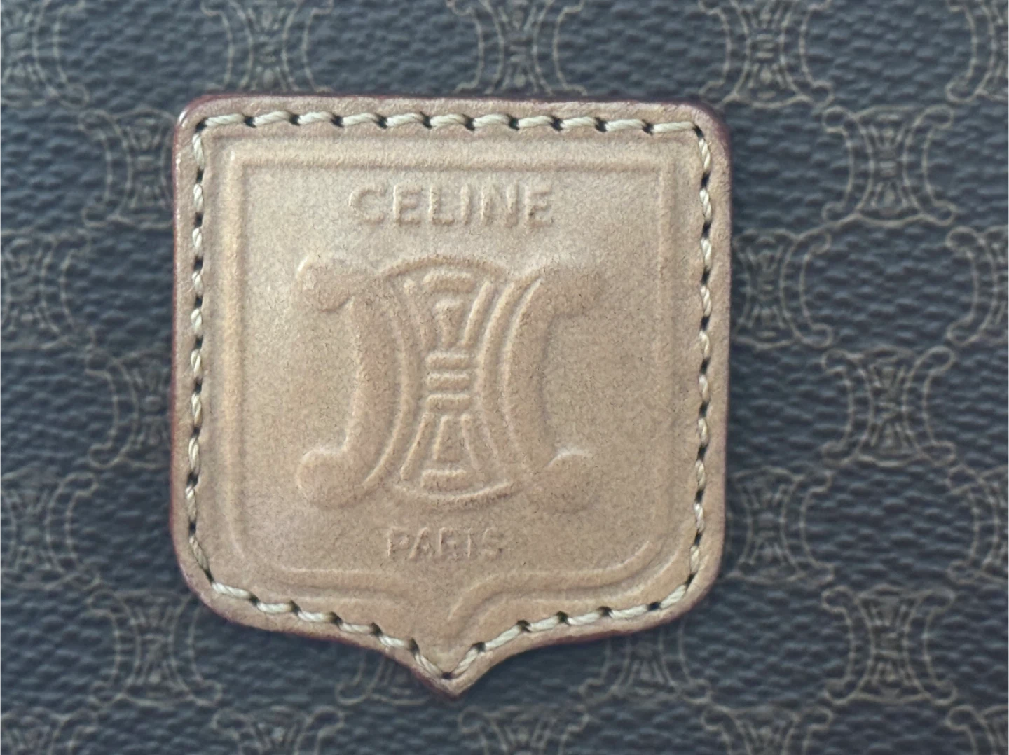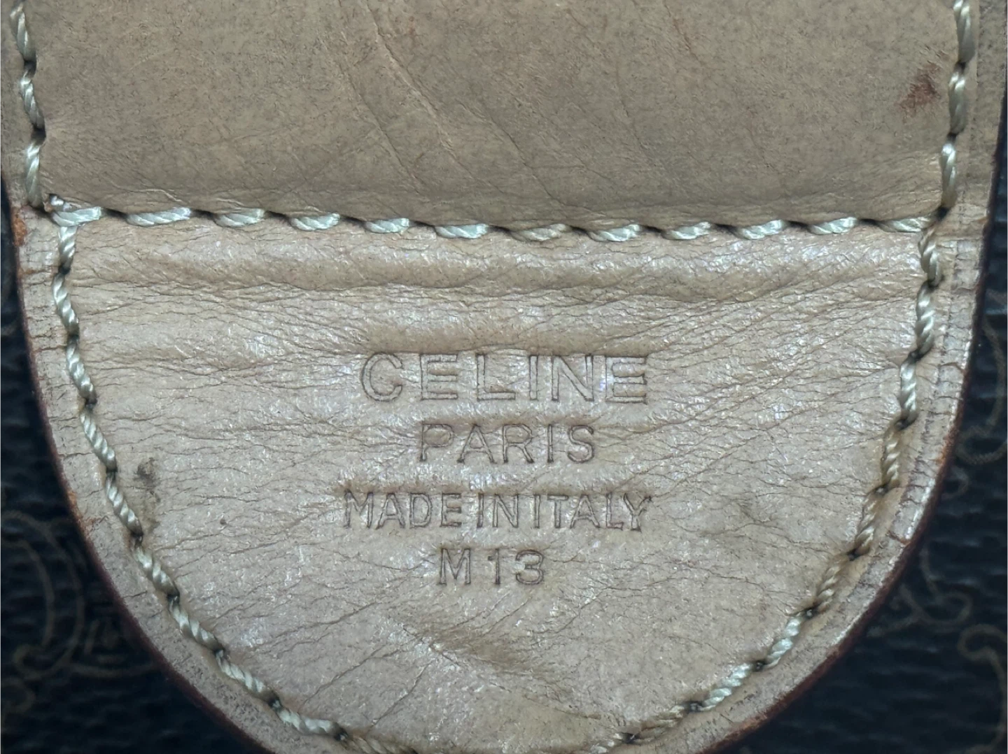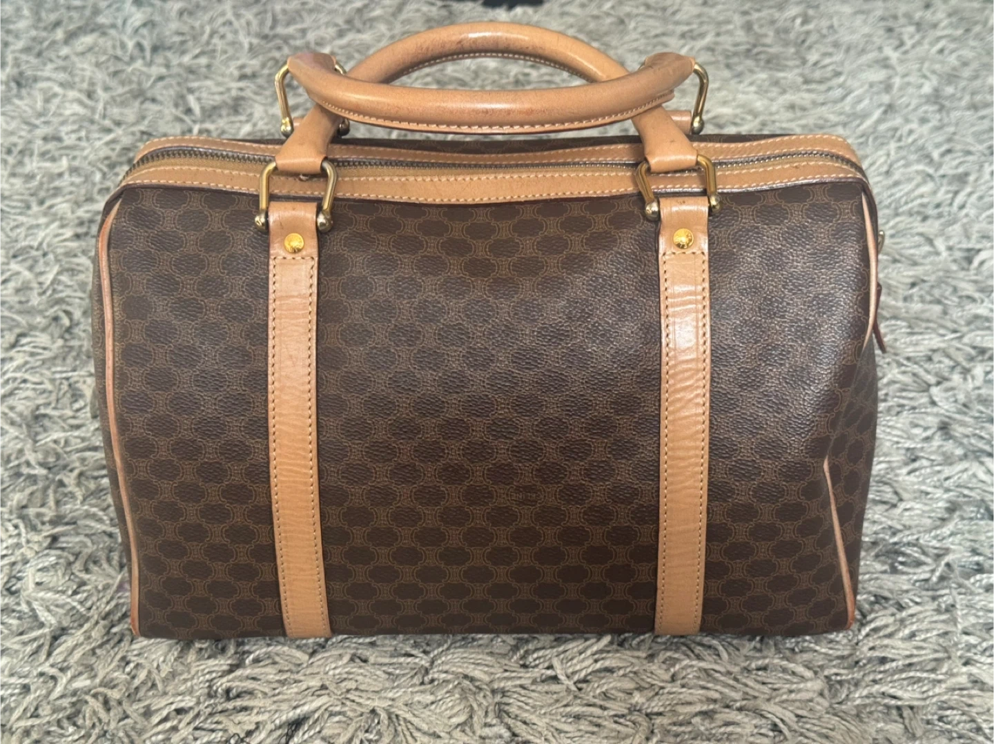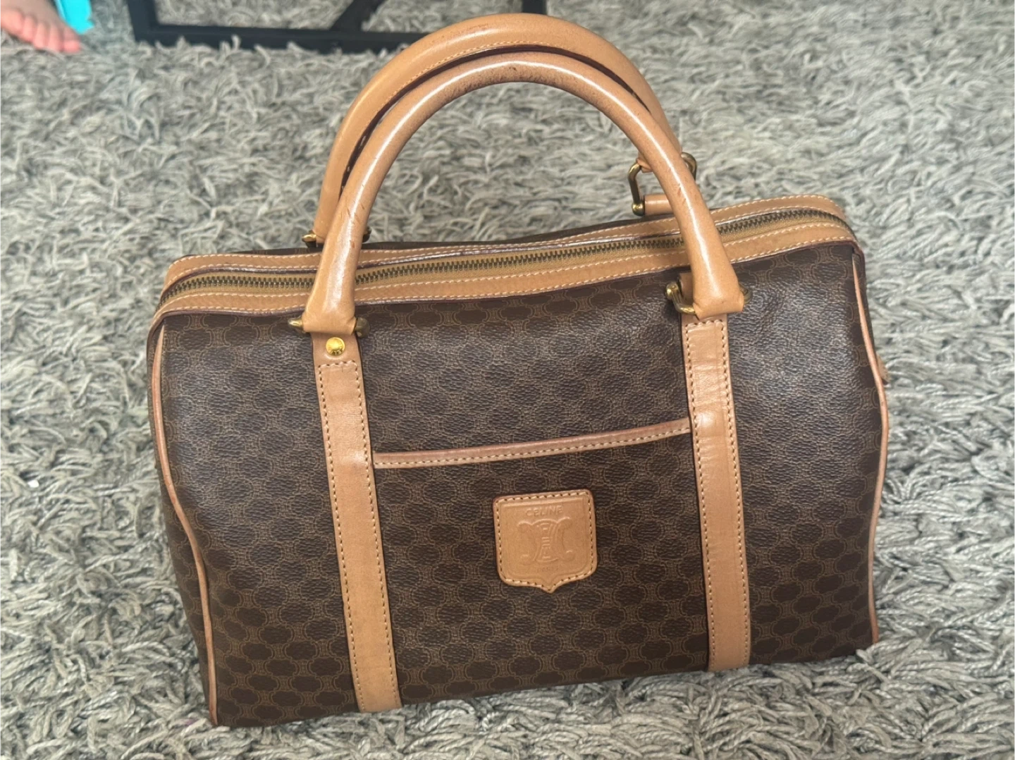 Selling a classic Celine Paris handbag! It features a brown leather exterior with the iconic Celine pattern. The bag has tan leather accents and handles, adding to its sophisticated look. There are some signs of wear, but it's still a stylish and functional piece!