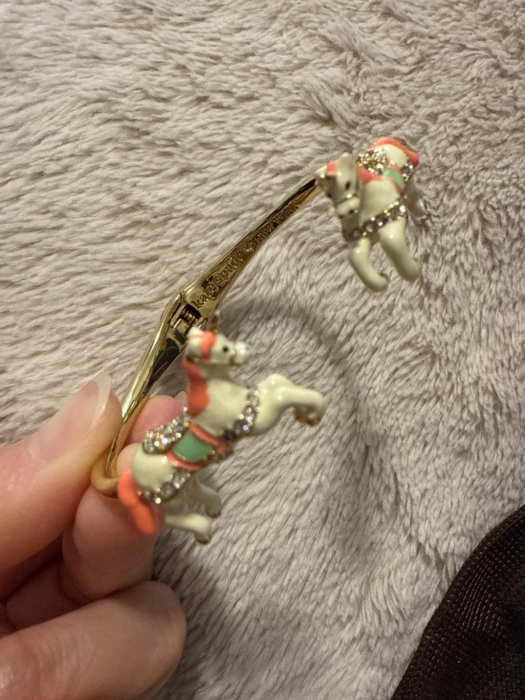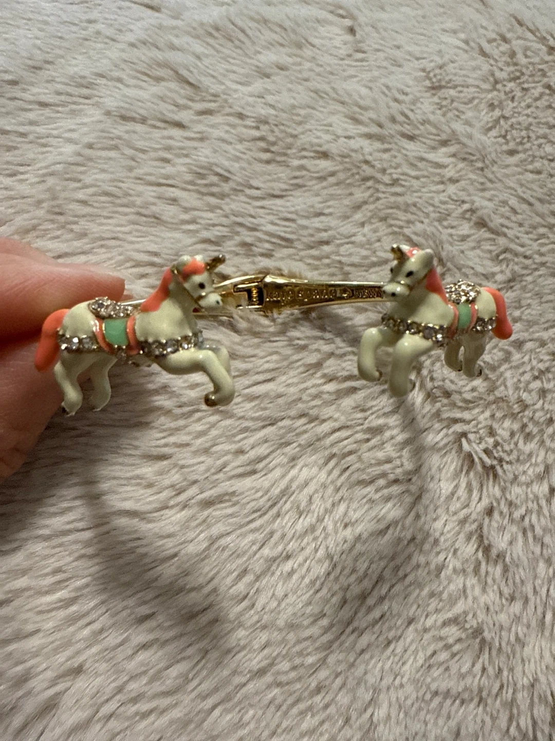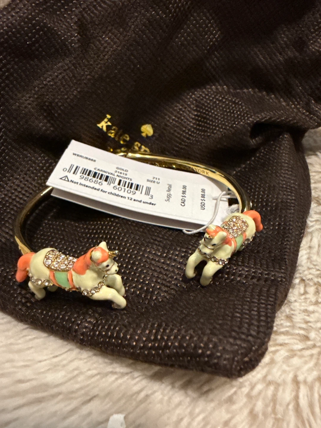 This is a Kate Spade bangle bracelet featuring carousel horses. It's a gold colour with multi-coloured horses. Super cute and in great condition!