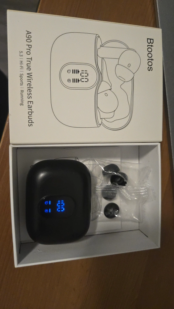 Selling a pair of Btootos A90 Pro True Wireless Earbuds. They come with the original box and extra earbud tips. Key features include: - 6-8 hours of playtime on a single charge (plus more with the charging box) - 1.5 hours charging time - Impedance of 32Ω - Bluetooth range of 2.401-2.480 GHz - 30mAh battery (headset), 300mAh (charging case) - Input: 5V/220mA - Output: 5V/150mA