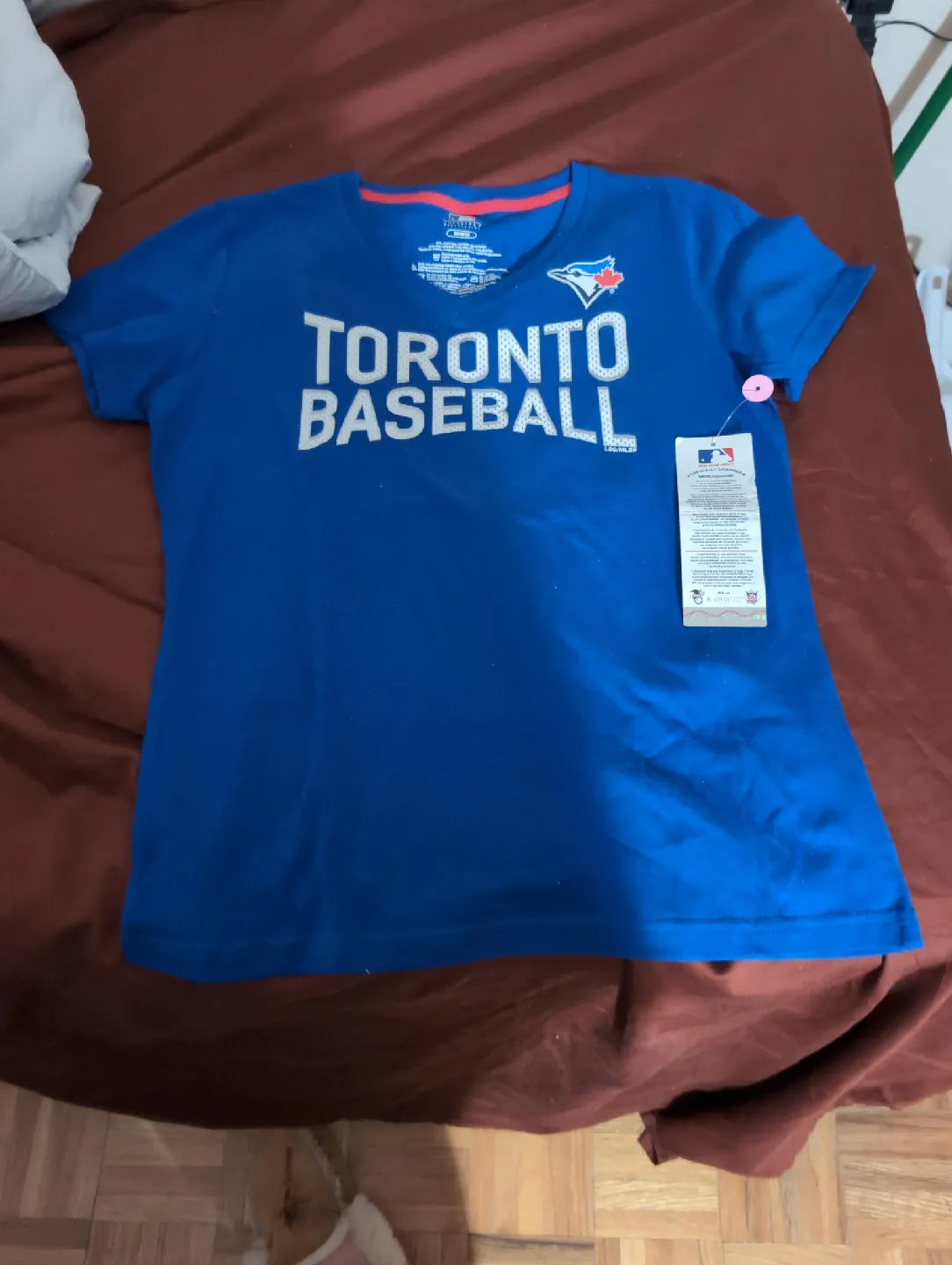 Selling a brand new with tags officially licenced LadiesToronto Blue Jays baseball t-shirt! The shirt is a vibrant blue and features the team logo and "TORONTO BASEBALL" in white lettering. It's a size medium and made of a comfortable cotton/polyester blend. Size M