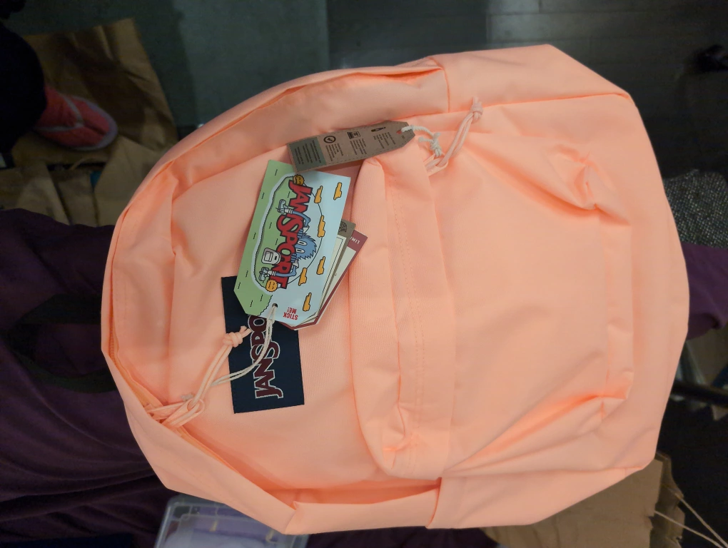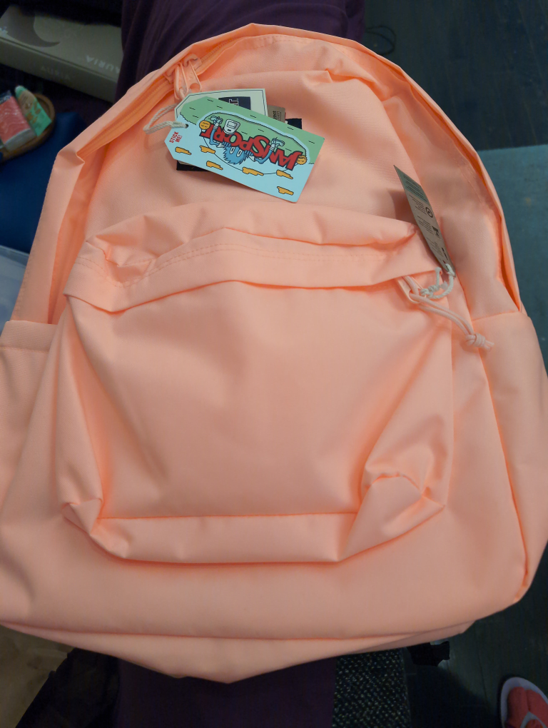 I'm selling a brand new Jansport backpack! It's a lovely peach colour and still has the tags on it. Perfect for school, work, or just carrying your things around town. It has a 15" laptop sleeve.