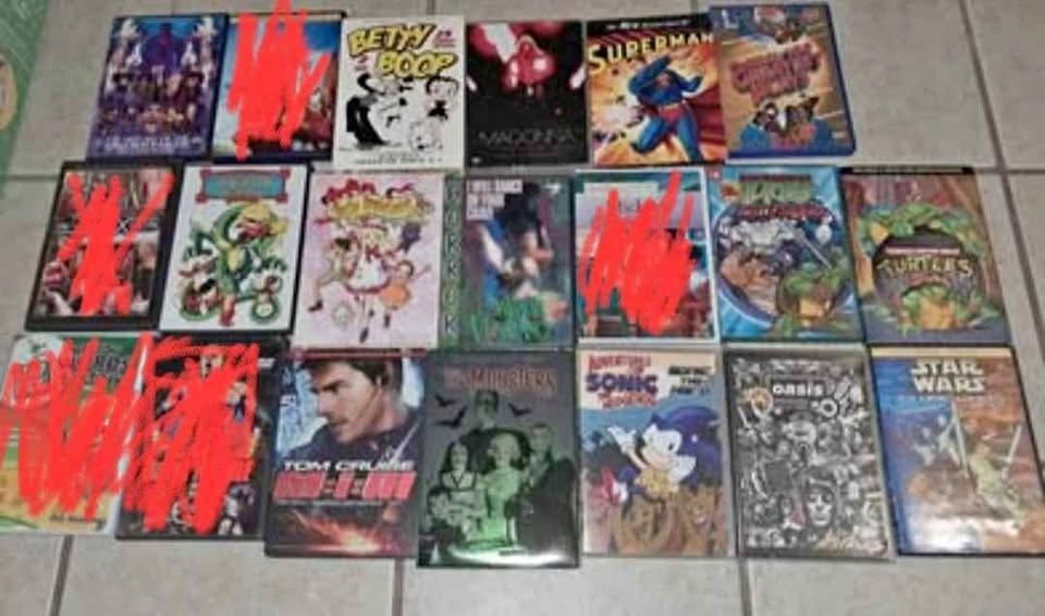 Collection of DVDs. Includes movies, cartoons, and music. Some titles include: The Lion King, Superman, Mickey's Christmas Carol, Teenage Mutant Ninja Turtles, and Star Wars: Clone Wars.