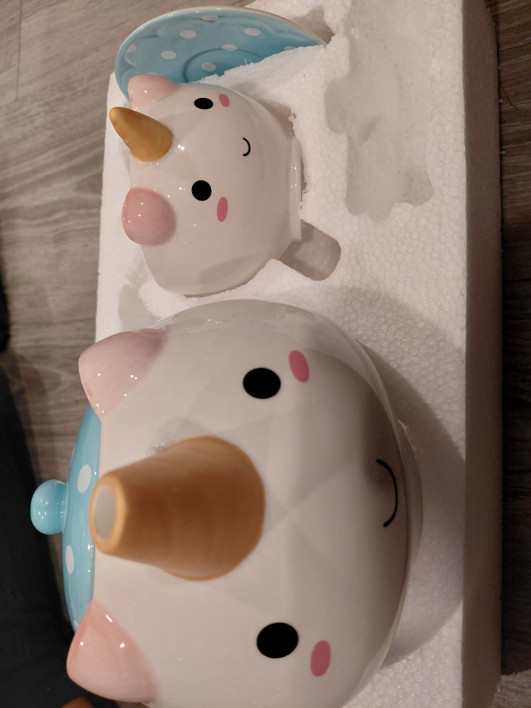 Super cute unicorn tea set! It's brand new and still in its original packaging. Perfect for a tea party or just adding a touch of whimsy to your kitchen