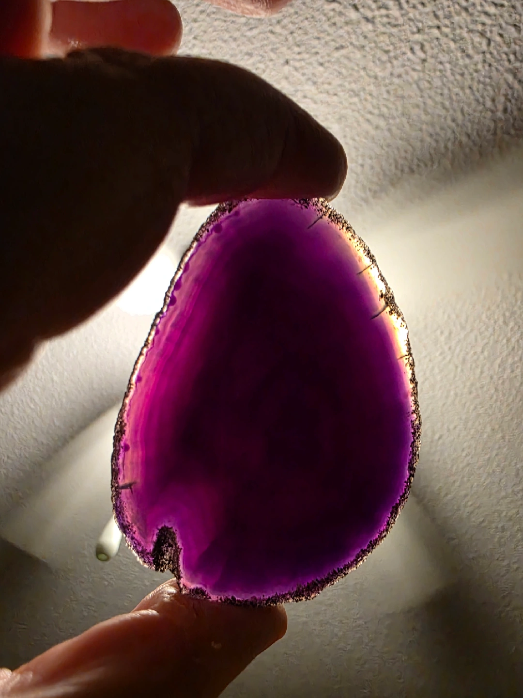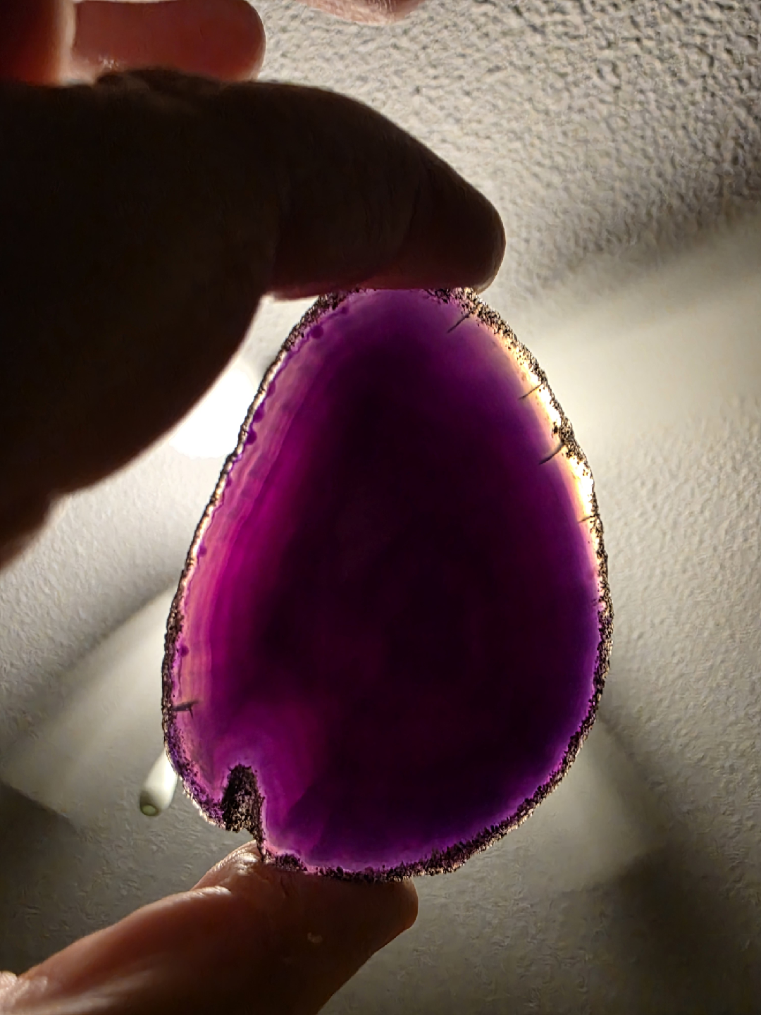 Selling a beautiful purple agate slice. It's a unique piece that would look great as a decorative item in your home or as part of a crystal collection. comes with a stand. Just under 3 inches. pickup near High Park Station.