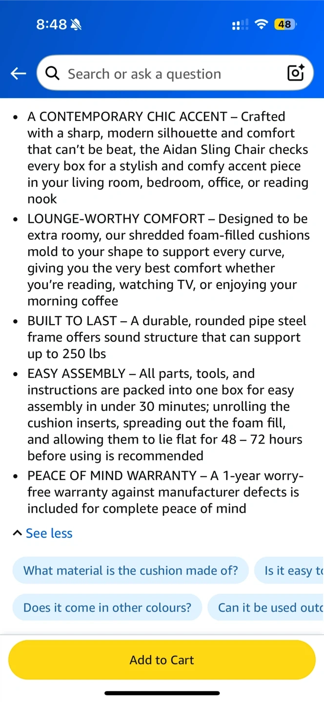 This contemporary chic Aidan Sling Chair is crafted with a sharp, modern silhouette that can't be beat! It's designed to be extra roomy with shredded foam-filled cushions that mold to your shape, making it perfect for watching TV or enjoying your morning coffee. Bought for 120$ before tax in January, perfect condition!