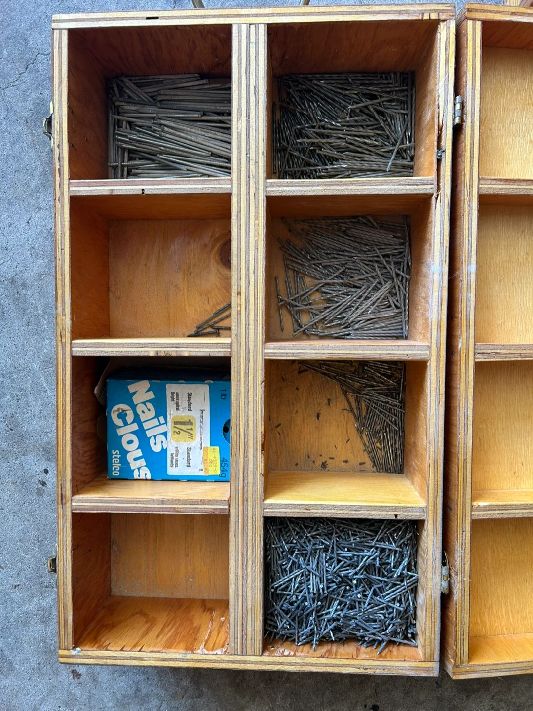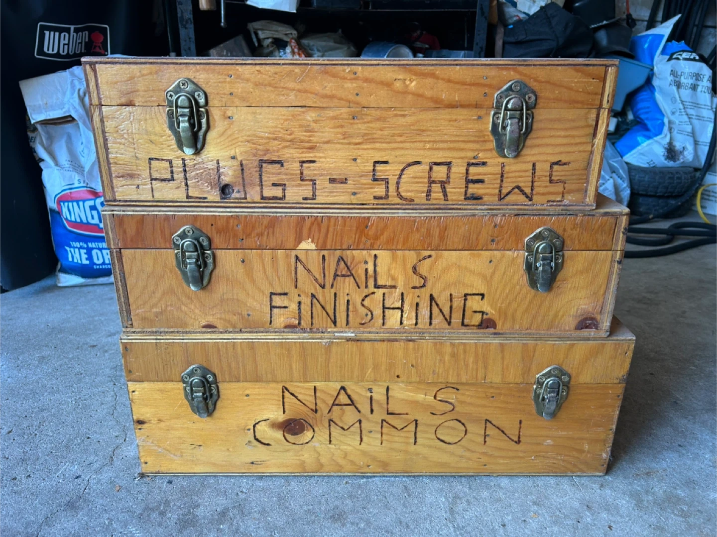 73Set of three wooden storage boxes, perfect for organizing your nails, screws, and other small hardware. Each box has multiple compartments to keep things tidy and easily accessible. The boxes are labeled for convenience: 'Plugs-Screws', 'Nails Finishing', and 'Nails Common'. Great for any workshop or DIY enthusiast!