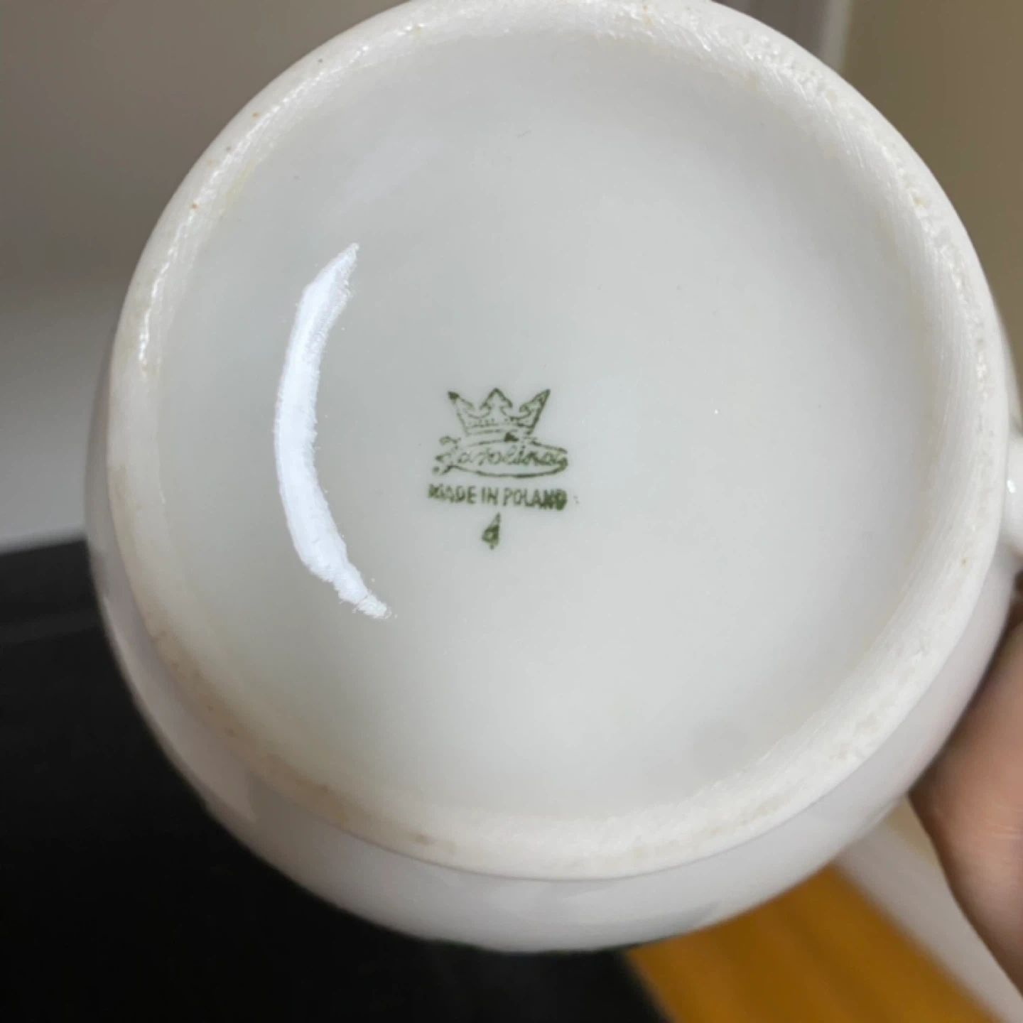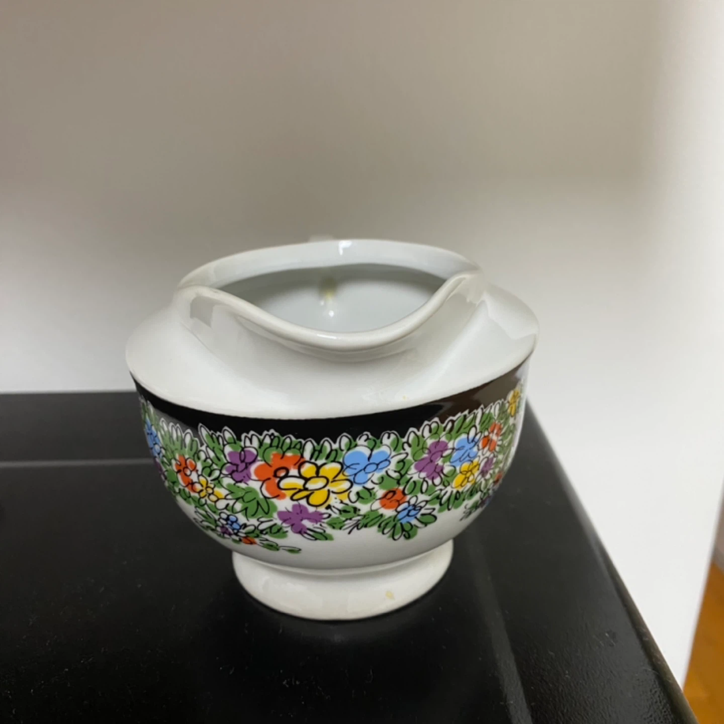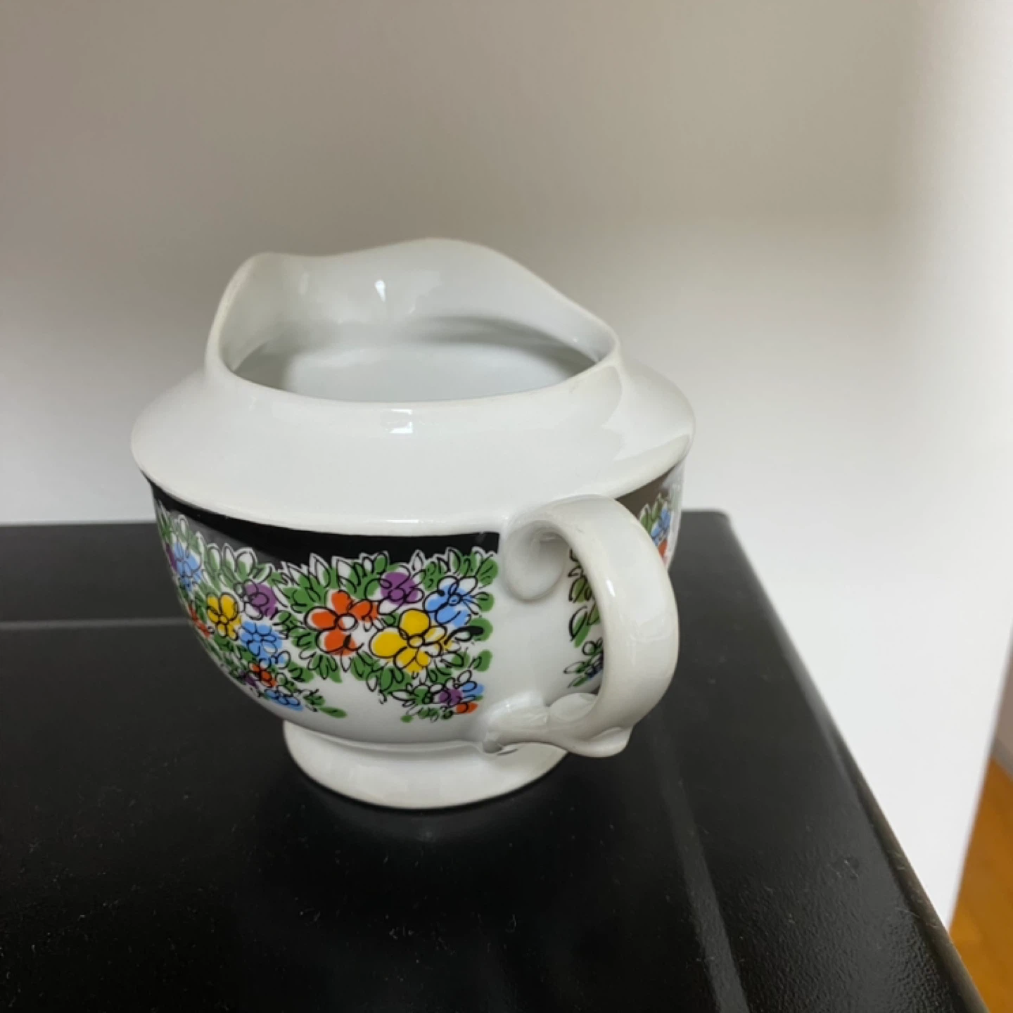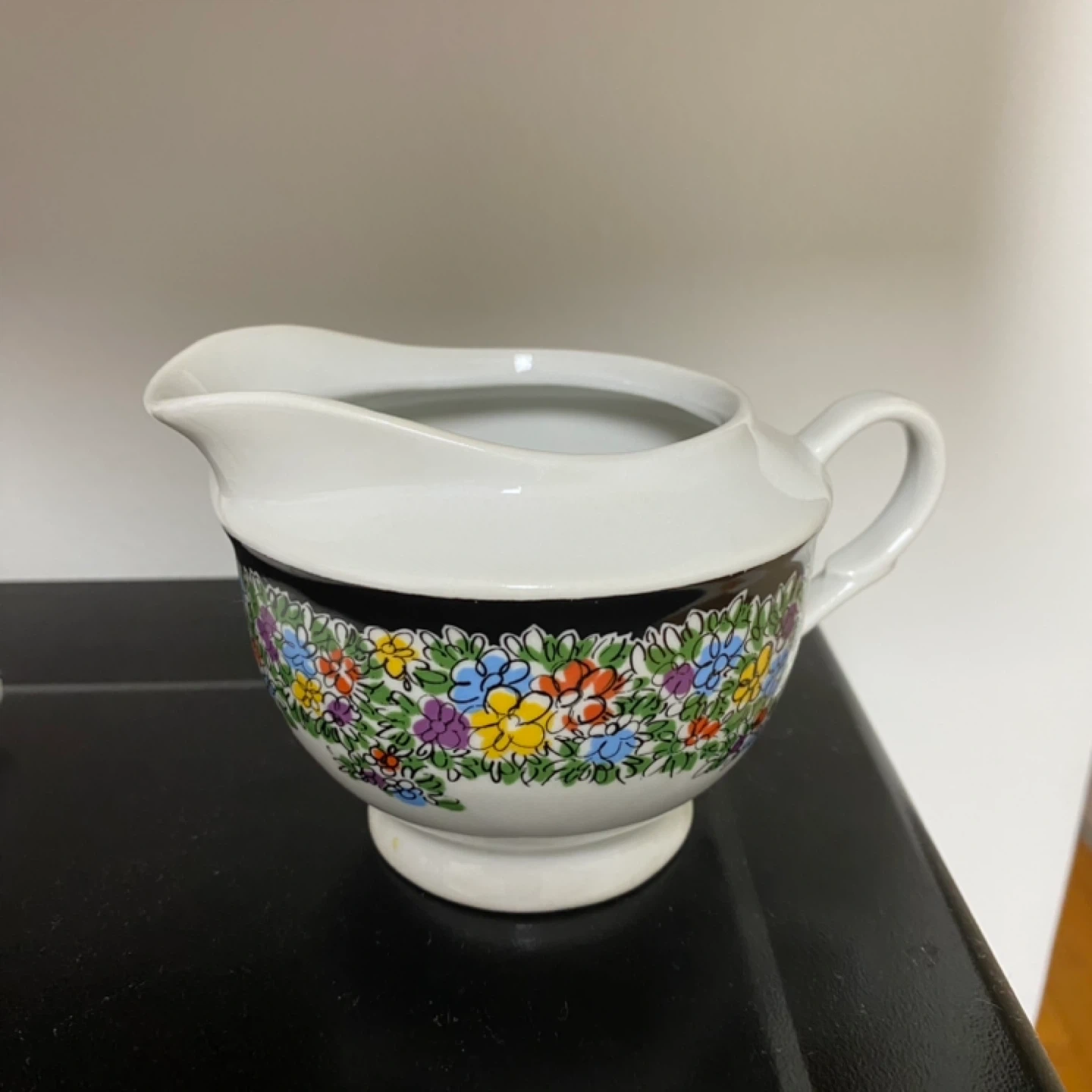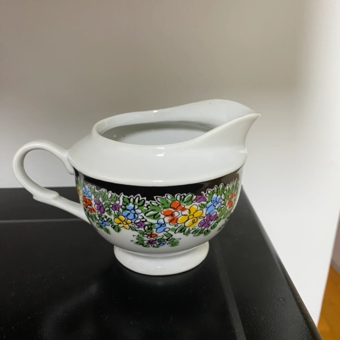 A lovely little creamer made by Porcelana in Poland! It has a beautiful floral design around the base and is in great shape. Perfect for your morning coffee or tea!