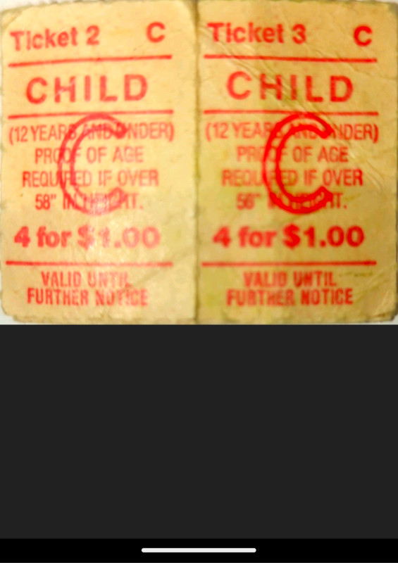 Two vintage child tickets. Four tickets for one dollar. Valid until further notice. For children 12 years and under. Proof of age required if over 58" in height.